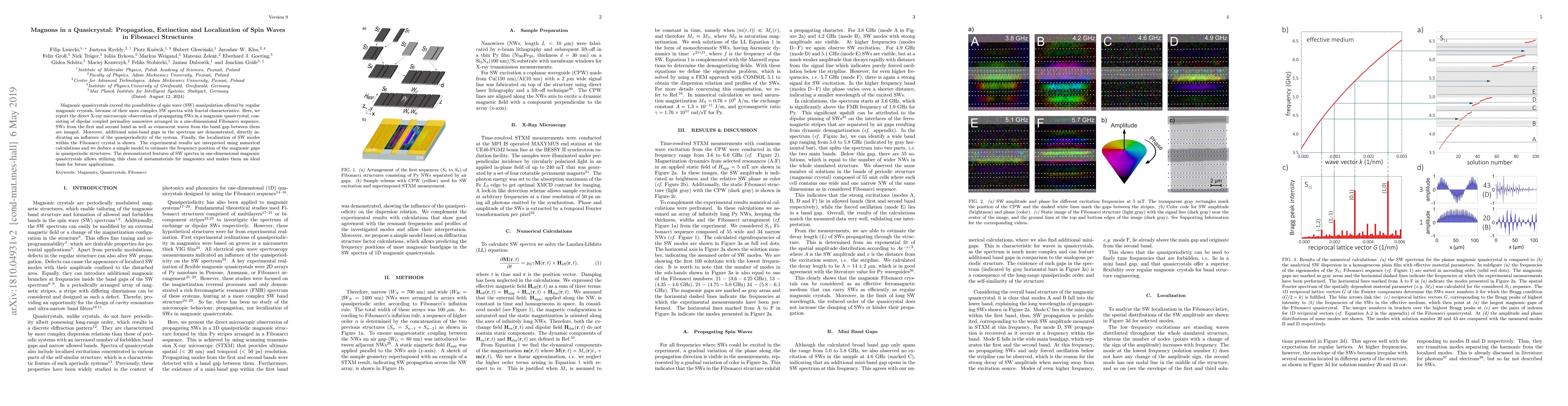 Magnonic quasicrystals exceed the possibilities of spin wave (SW) manipulation offered by regular magnonic crystals, because of their more complex SW spectra with fractal characteristics. Here, we report the direct x-ray microscopic observation of propagating SWs in a magnonic quasicrystal, consisting of dipolarly coupled permalloy nanowires arranged in a one-dimensional Fibonacci sequence. SWs from the first and second band as well as evanescent waves from the band gap between them are imaged. Moreover, additional mini-band gaps in the spectrum are demonstrated, directly indicating an influence of the quasiperiodicity of the system. The experimental results are interpreted using numerical calculations and we deduce a simple model to estimate the frequency position of the magnonic gaps in quasiperiodic structures. The demonstrated features of SW spectra in one-dimensional magnonic quasicrystals allows utilizing this class of metamaterials for magnonics and makes them an ideal basis for future applications.