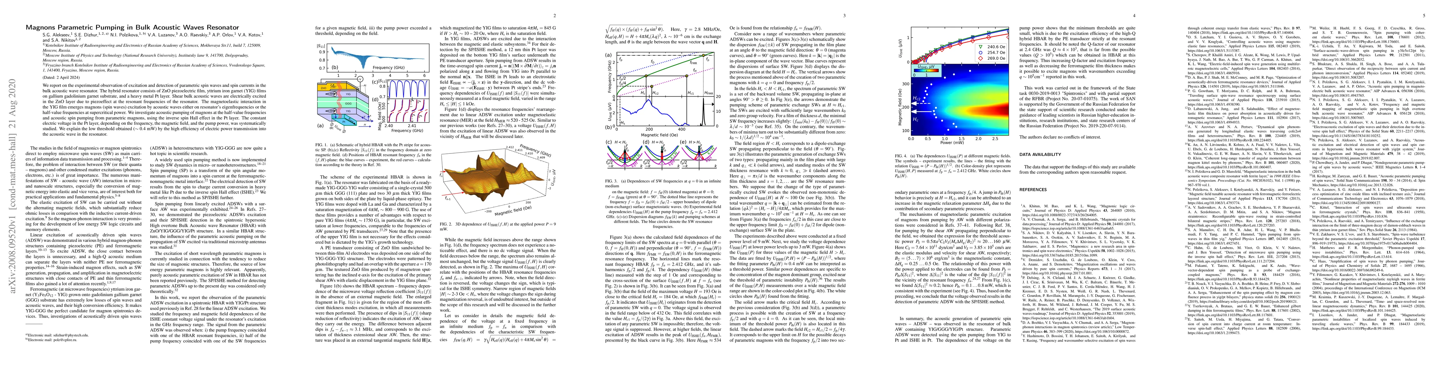 This paper reports the observation of parametric pumping of magnons in a bulk acoustic wave resonator, combining ZnO, YIG, and Pt layers. The study investigates magnon excitation via magnetoelastic interaction, achieving low-threshold spin wave generation using the inverse spin Hall effect.