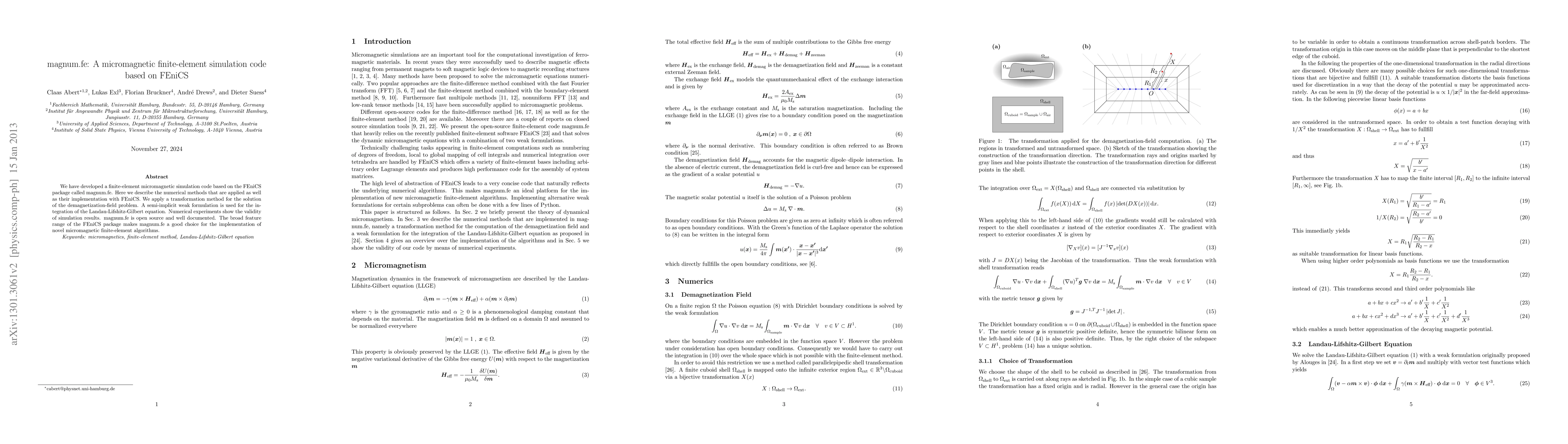 Summary: magnum.fe is a micromagnetic simulation code built on the FEniCS package, employing a transformation method for demagnetization and a semi-implicit weak formulation for the Landau-Lifshitz-Gilbert equation. It is open source, well-documented, and validated through numerical experiments.