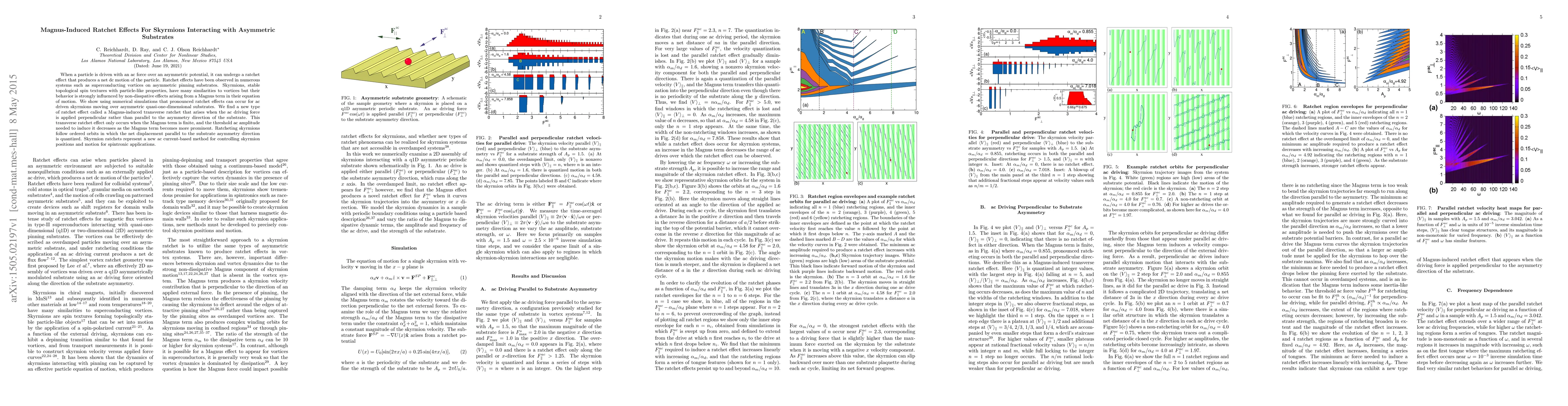 This paper demonstrates that ac-driven skyrmions exhibit pronounced ratchet effects when interacting with asymmetric substrates, revealing a novel Magnus-induced transverse ratchet effect. This effect, dependent on the Magnus term, provides a new method for controlling skyrmion positions and motion in spintronic applications.