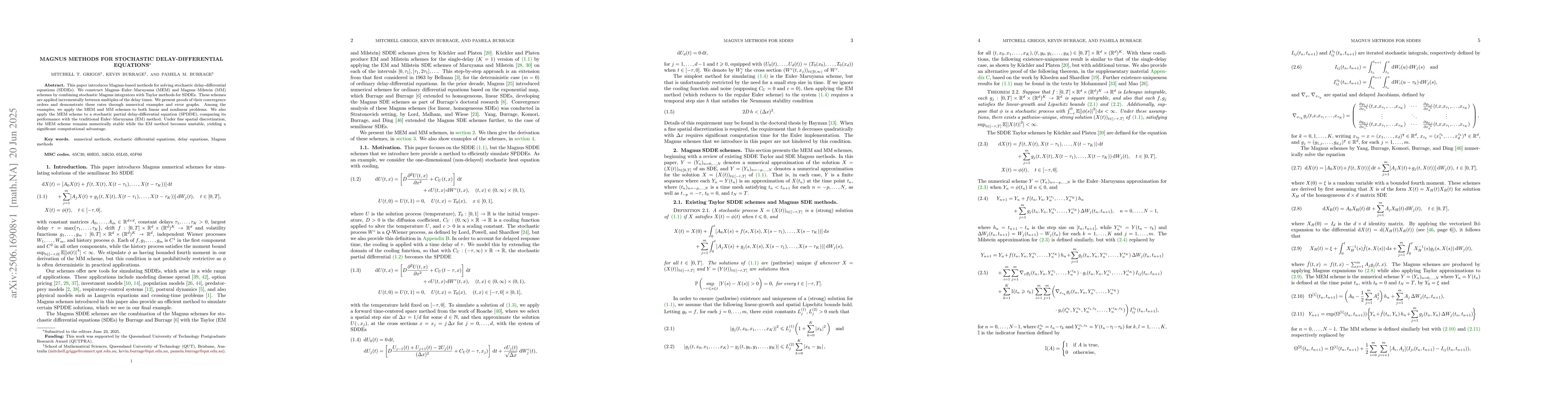 The paper introduces Magnus-based methods for solving stochastic delay-differential equations (SDDEs) by constructing Magnus--Euler--Maruyama (MEM) and Magnus--Milstein (MM) schemes, which combine stochastic Magnus integrators with Taylor methods. These schemes are applied incrementally between multiples of the delay times.