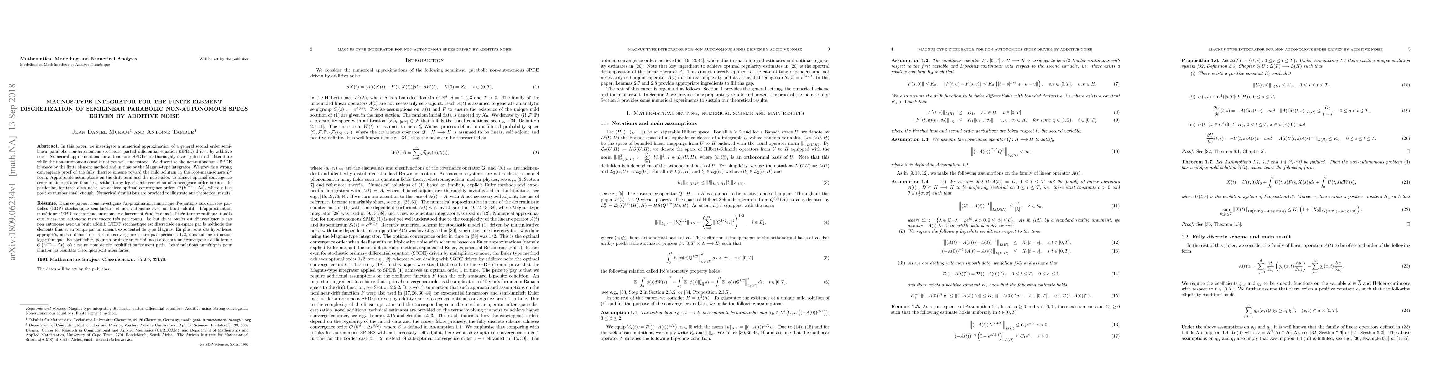 This paper develops a numerical method for semilinear parabolic non-autonomous SPDEs driven by additive noise, utilizing finite element space discretization and a Magnus-type integrator for time. The authors achieve strong convergence and optimal convergence rates in time without logarithmic reduction, validated by theoretical proofs and numerical simulations.
