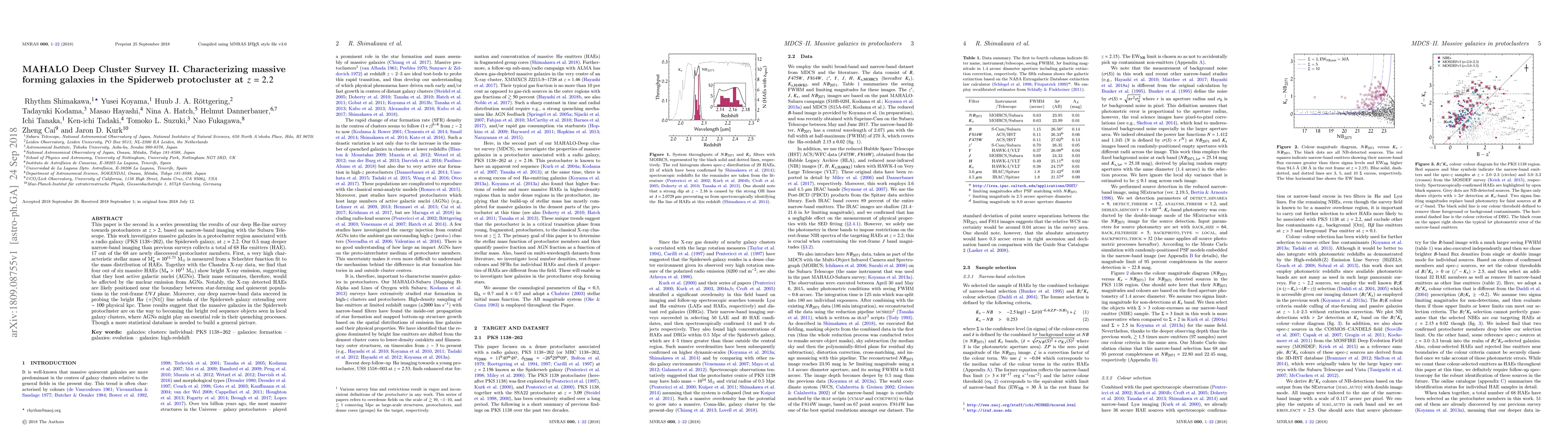 This study characterizes massive forming galaxies in the Spiderweb protocluster at z=2.2 using deep H$\alpha$-line surveys, revealing a high stellar mass and suggesting active galactic nuclei (AGNs) in some galaxies, which may influence their evolution towards red sequence objects.