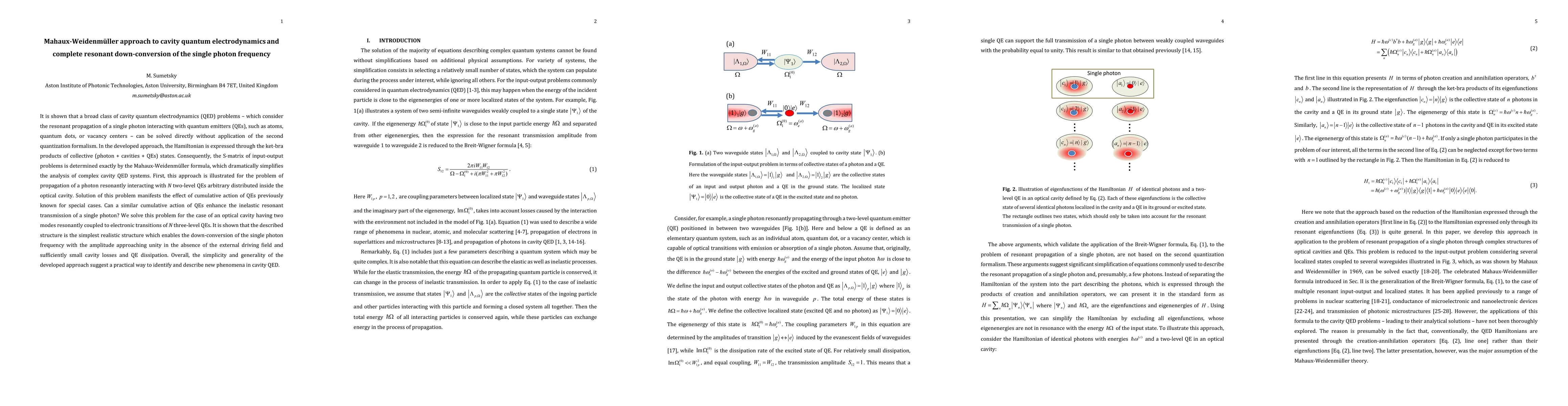 It is shown that a broad class of cavity quantum electrodynamics (QED) problems - which consider the resonant propagation of a single photon interacting with quantum emitters (QEs), such as atoms, quantum dots, or vacancy centers - can be solved directly without application of the second quantization formalism. In the developed approach, the Hamiltonian is expressed through the ket-bra products of collective (photon + cavities + QEs) states. Consequently, the S-matrix of input-output problems is determined exactly by the Mahaux-Weidenm\"uller formula, which dramatically simplifies the analysis of complex cavity QED systems. First, this approach is illustrated for the problem of propagation of a photon resonantly interacting with N two-level QEs arbitrary distributed inside the optical cavity. Solution of this problem manifests the effect of cumulative action of QEs previously known for special cases. Can a similar cumulative action of QEs enhance the inelastic resonant transmission of a single photon? We solve this problem for the case of an optical cavity having two modes resonantly coupled to electronic transitions of N three-level QEs. It is shown that the described structure is the simplest realistic structure which enables the down-conversion of the single photon frequency with the amplitude approaching unity in the absence of the external driving field and for sufficiently small cavity losses and QE dissipation. Overall, the simplicity and generality of the developed approach suggest a practical way to identify and describe new phenomena in cavity QED.