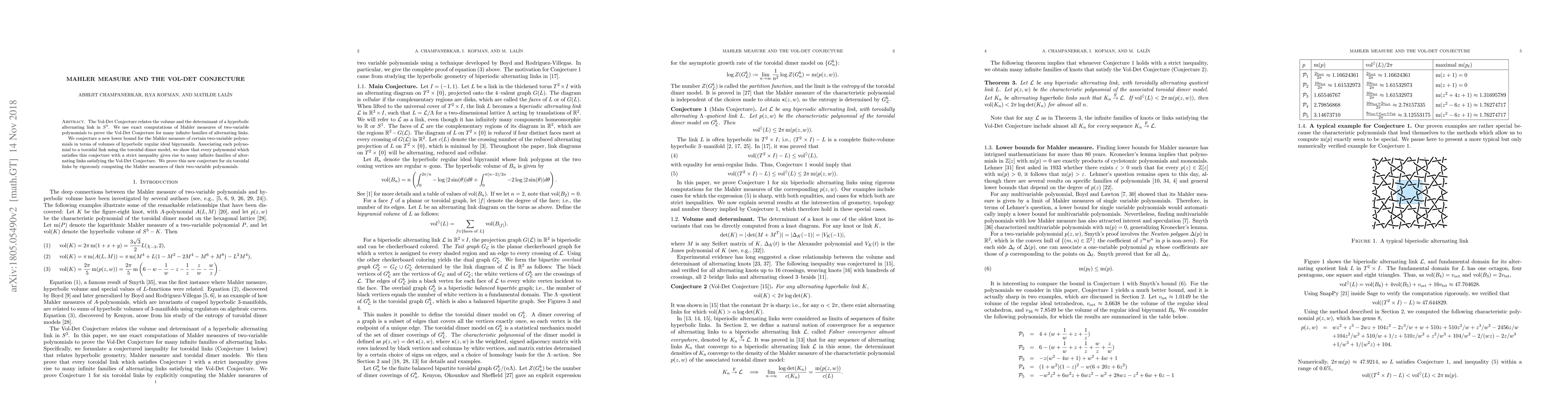 The paper proves the Vol-Det Conjecture for numerous infinite families of alternating links using Mahler measures of two-variable polynomials. It also proposes a new lower bound conjecture for Mahler measures linked to volumes of hyperbolic regular ideal bipyramids.