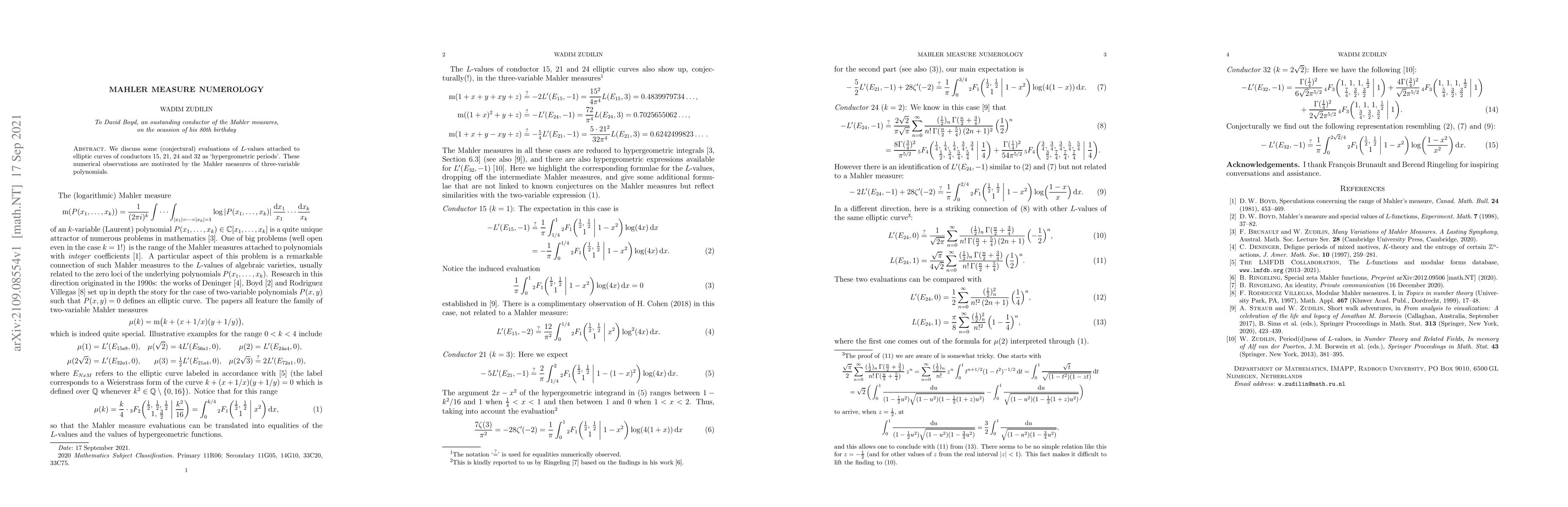 We discuss some (conjectural) evaluations of $L$-values attached to elliptic curves of conductors 15, 21, 24 and 32 as "hypergeometric periods". These numerical observations are motivated by the Mahler measures of three-variable polynomials.