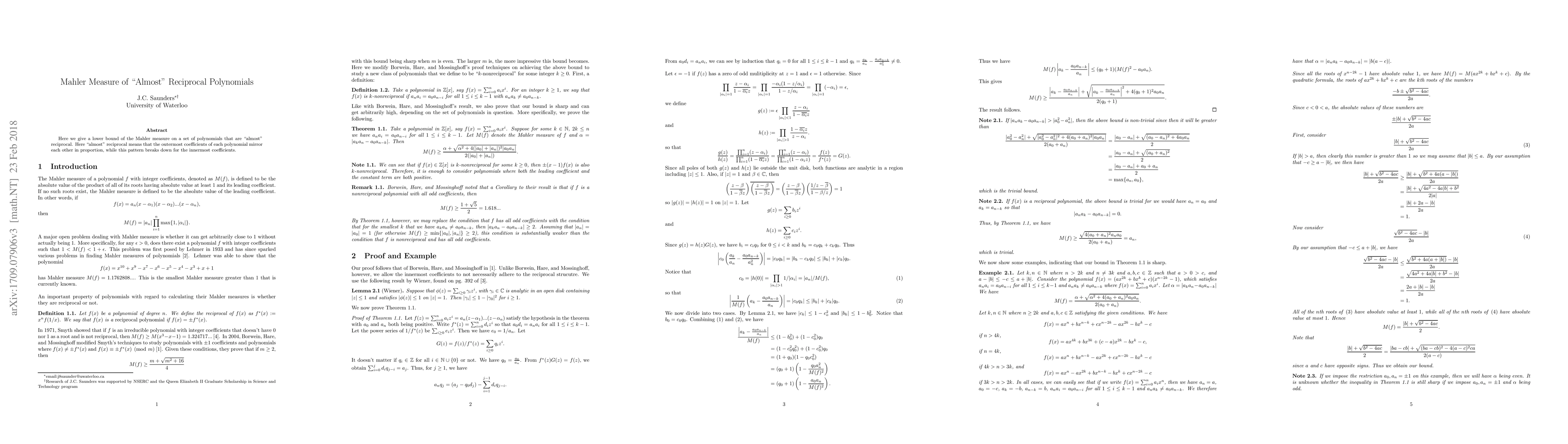 Summary: The paper establishes a lower bound for the Mahler measure on a class of polynomials termed "almost" reciprocal, where the outermost coefficients mirror each other proportionally, but the innermost coefficients deviate from this pattern. This provides insight into the distribution and properties of these specific polynomial structures.