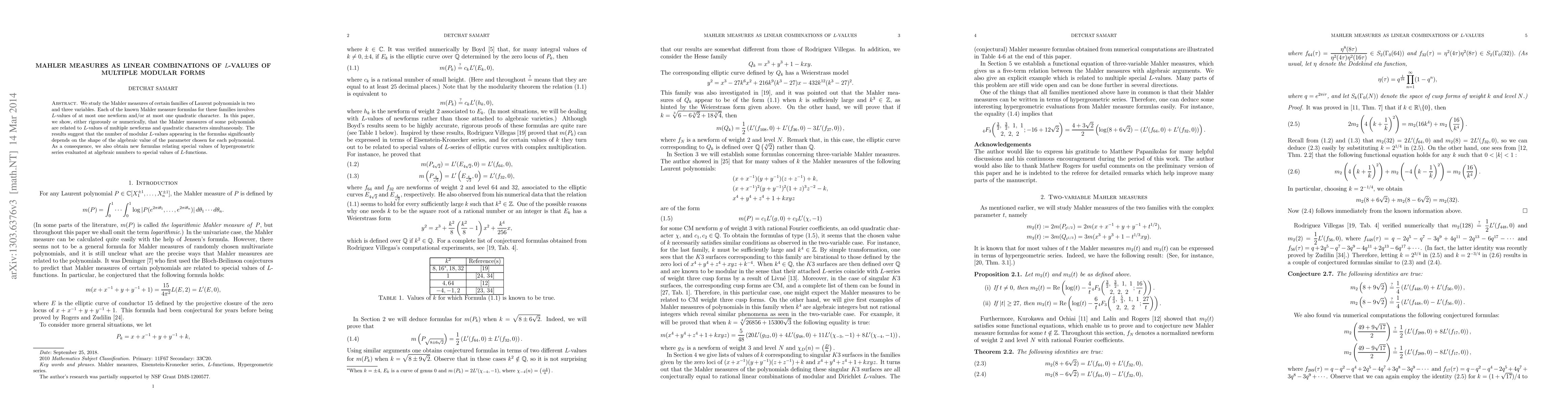 This research demonstrates that Mahler measures of certain Laurent polynomials in two and three variables can be expressed as linear combinations of $L$-values from multiple newforms and quadratic characters, challenging existing formulas that involve only one such $L$-value. The findings suggest a significant dependency of these $L$-values on the specific algebraic parameter values chosen for each polynomial.