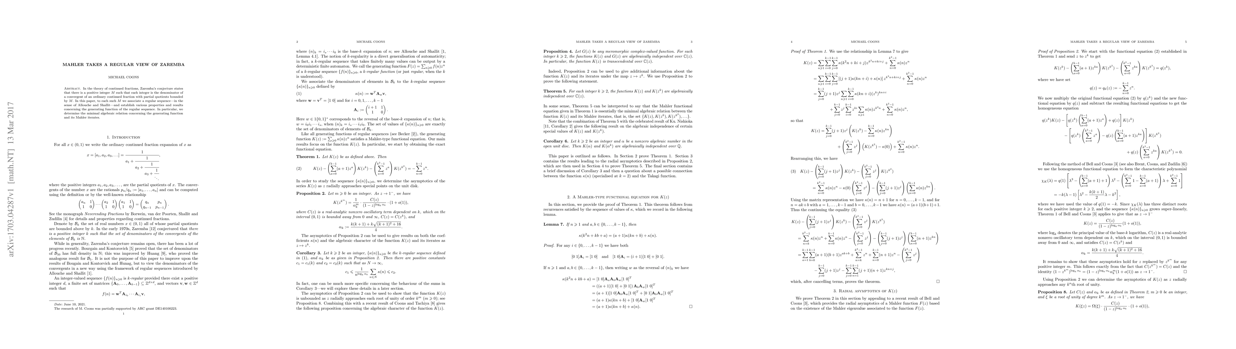 In the theory of continued fractions, Zaremba's conjecture states that there is a positive integer $M$ such that each integer is the denominator of a convergent of an ordinary continued fraction with partial quotients bounded by $M$. In this paper, to each such $M$ we associate a regular sequence---in the sense of Allouche and Shallit---and establish various properties and results concerning the generating function of the regular sequence. In particular, we determine the minimal algebraic relation concerning the generating function and its Mahler iterates.