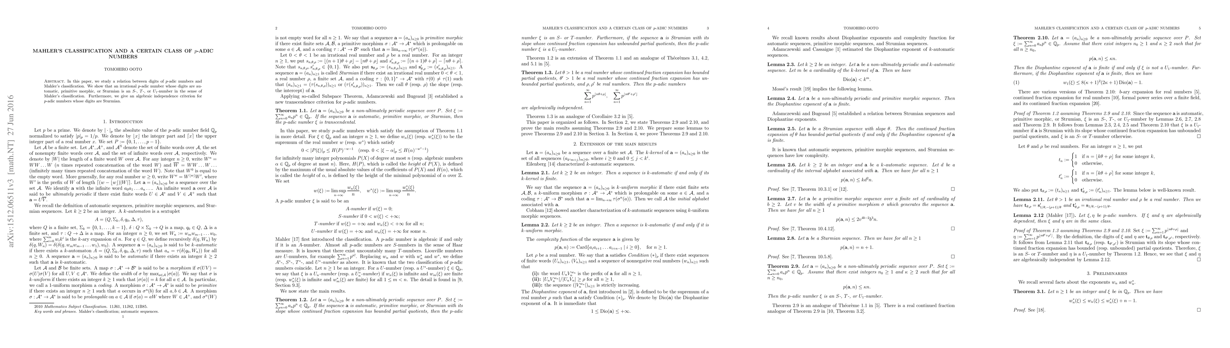 This paper explores the connection between Mahler's classification of real numbers and the digits of $p$-adic numbers, demonstrating that certain types of $p$-adic irrationals fall into Mahler's $S$-, $T$-, or $U_1$-categories based on their digit properties. It also provides a criterion for algebraic independence for $p$-adic numbers with Sturmian digits.