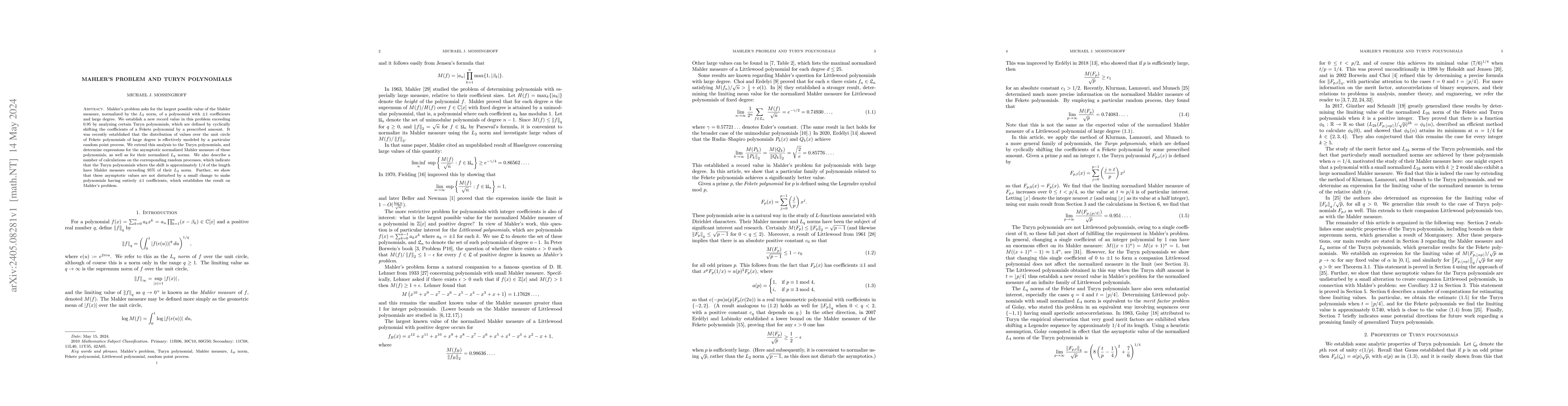 This research establishes a new record value exceeding 0.95 for the normalized Mahler measure of polynomials with $\pm1$ coefficients, by analyzing Turyn polynomials derived from Fekete polynomials. It shows that shifting these coefficients by about 1/4 of their length yields polynomials with a Mahler measure close to 95% of their $L_2$ norm, solving Mahler's problem.
