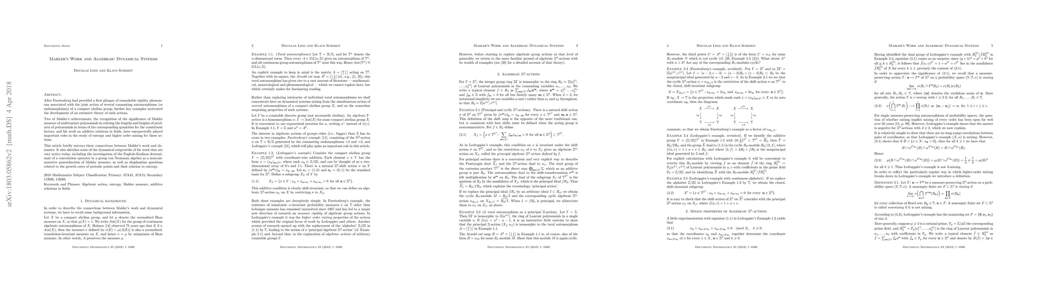 After Furstenberg had provided a first glimpse of remarkable rigidity phenomena associated with the joint action of several commuting automorphisms (or endomorphisms) of a compact abelian group, further key examples motivated the development of an extensive theory of such actions. Two of Mahler's achievements, the recognition of the significance of Mahler measure of multivariate polynomials in relating the lengths and heights of products of polynomials in terms of the corresponding quantities for the constituent factors, and his work on additive relations in fields, have unexpectedly played important roles in the study of entropy and higher order mixing for these actions. This article briefly surveys these connections between Mahler's work and dynamics. It also sketches some of the dynamical outgrowths of his work that are very active today, including the investigation of the Fuglede-Kadison determinant of a convolution operator in a group von Neumann algebra as a noncommutative generalization of Mahler measure, as well as diophantine questions related to the growth rates of periodic points and their relation to entropy.