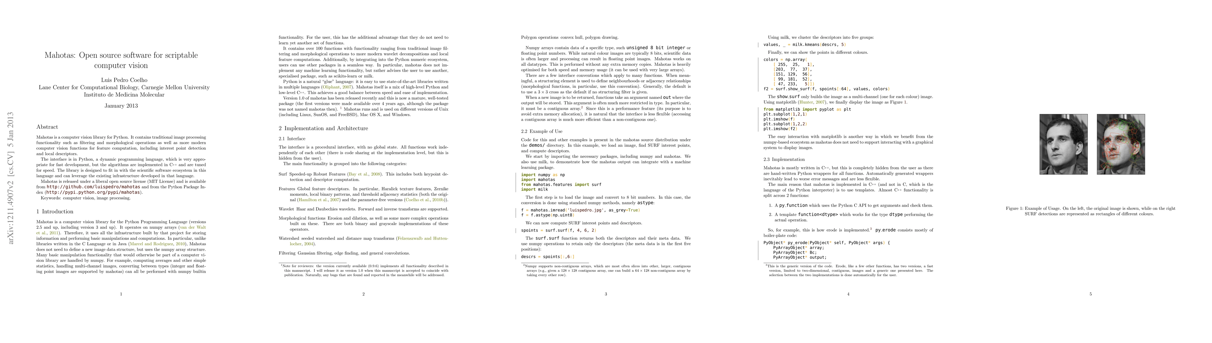 Mahotas is an open-source Python library for computer vision with a focus on image processing and feature computation, implemented in C++ for speed. It is released under the MIT License and integrates well with the scientific Python ecosystem.