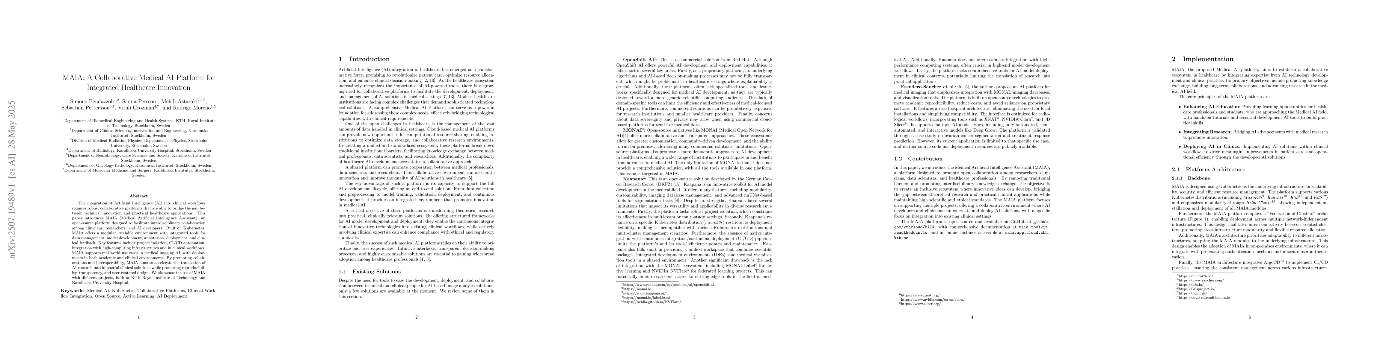 The integration of Artificial Intelligence (AI) into clinical workflows requires robust collaborative platforms that are able to bridge the gap between technical innovation and practical healthcare applications. This paper introduces MAIA (Medical Artificial Intelligence Assistant), an open-source platform designed to facilitate interdisciplinary collaboration among clinicians, researchers, and AI developers. Built on Kubernetes, MAIA offers a modular, scalable environment with integrated tools for data management, model development, annotation, deployment, and clinical feedback. Key features include project isolation, CI/CD automation, integration with high-computing infrastructures and in clinical workflows. MAIA supports real-world use cases in medical imaging AI, with deployments in both academic and clinical environments. By promoting collaborations and interoperability, MAIA aims to accelerate the translation of AI research into impactful clinical solutions while promoting reproducibility, transparency, and user-centered design. We showcase the use of MAIA with different projects, both at KTH Royal Institute of Technology and Karolinska University Hospital.