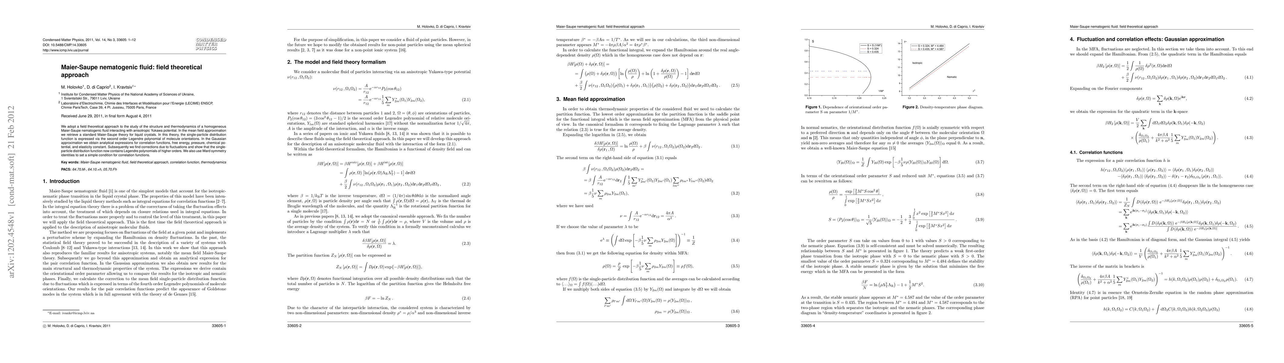 We adopt a field theoretical approach to study the structure and thermodynamics of a homogeneous Maier-Saupe nematogenic fluid interacting with anisotropic Yukawa potential. In the mean field approximation we retrieve the standard Maier-Saupe theory for liquid crystals. In this theory the density is expressed via the second order Legendre polynomial of molecule orientations. In the Gaussian approximation we obtain analytical expressions for the correlation functions, the elasticity constant, the free energy, the pressure, and the chemical potential. We also use Ward symmetry identities to set a simple condition for the correlation functions. Subsequently we find corrections due to fluctuations and show that density now contains Legendre polynomials of higher orders.