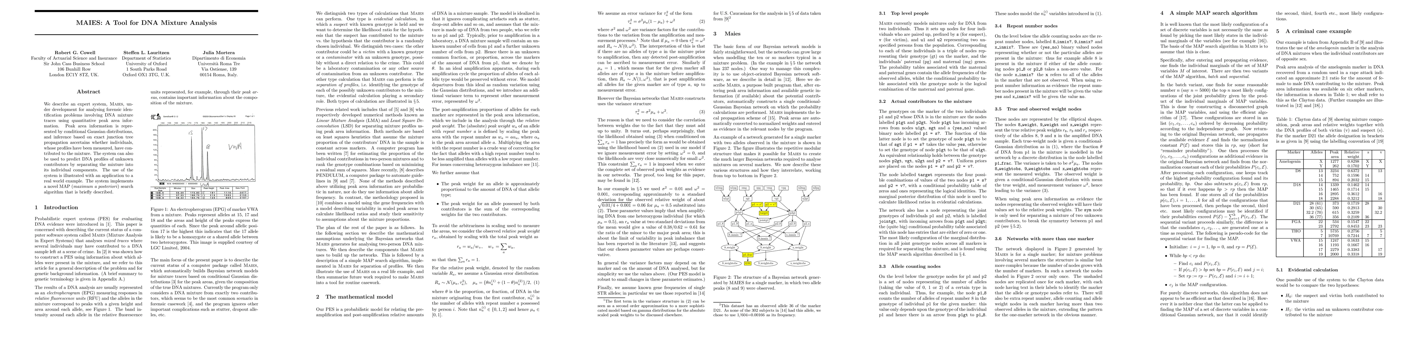 We describe an expert system, MAIES, developed for analysing forensic identification problems involving DNA mixture traces using quantitative peak area information. Peak area information is represented by conditional Gaussian distributions, and inference based on exact junction tree propagation ascertains whether individuals, whose profiles have been measured, have contributed to the mixture. The system can also be used to predict DNA profiles of unknown contributors by separating the mixture into its individual components. The use of the system is illustrated with an application to a real world example. The system implements a novel MAP (maximum a posteriori) search algorithm that is described in an appendix.
