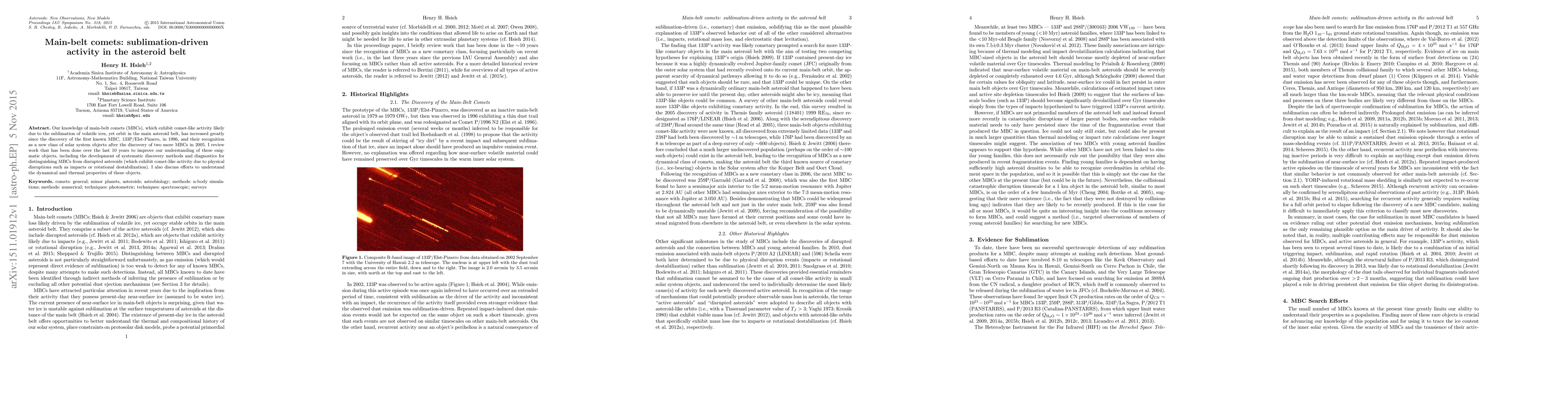 This paper reviews advancements in understanding main-belt comets (MBCs), objects exhibiting comet-like activity due to sublimation of volatile ices within the asteroid belt, since the discovery of the first MBC in 1996. It highlights systematic discovery methods and diagnostics to distinguish MBCs from disrupted asteroids, along with efforts to explore their dynamical and thermal properties.