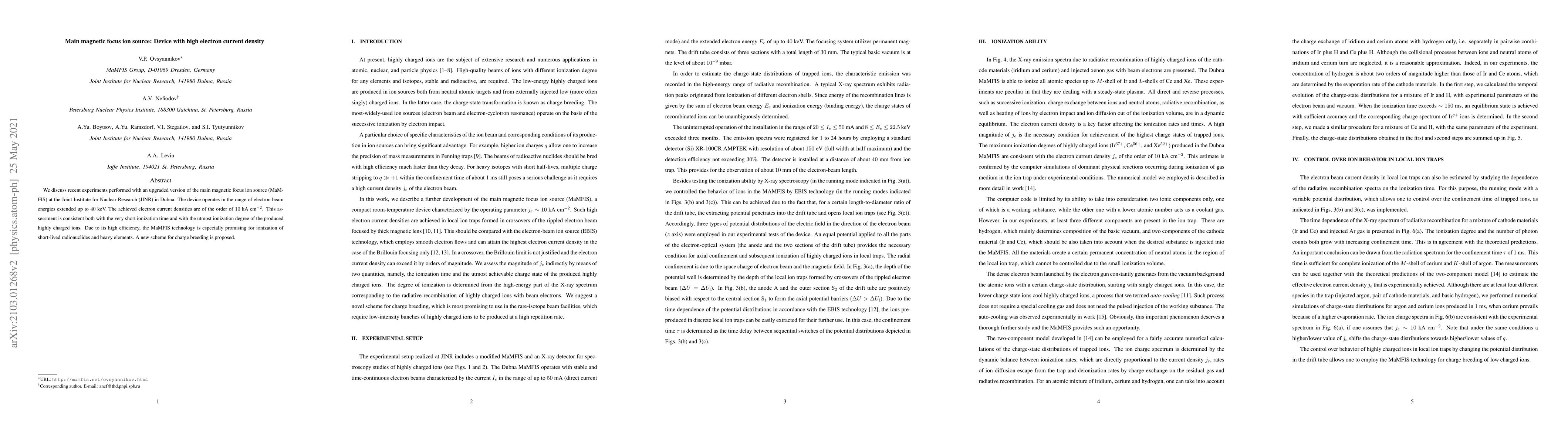 The upgraded main magnetic focus ion source (MaMFIS) at JINR achieves electron current densities of $10$ kA/cm$^{2}$ up to $40$ keV, promising for ionizing short-lived radionuclides and heavy elements. A new charge breeding scheme is proposed to enhance its efficiency.