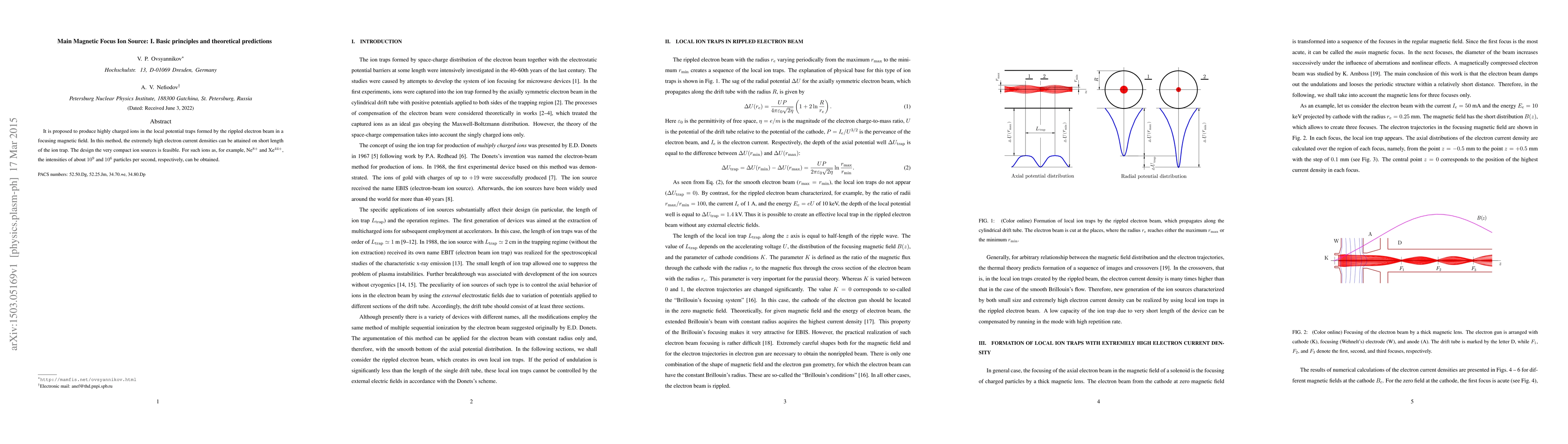 It is proposed to produce highly charged ions in the local potential traps formed by the rippled electron beam in a focusing magnetic field. In this method, the extremely high electron current densities can be attained on short length of the ion trap. The design the very compact ion sources is feasible. For such ions as, for example, Ne${}^{8+}$ and Xe${}^{44+}$, the intensities of about $10^9$ and $10^6$ particles per second, respectively, can be obtained.