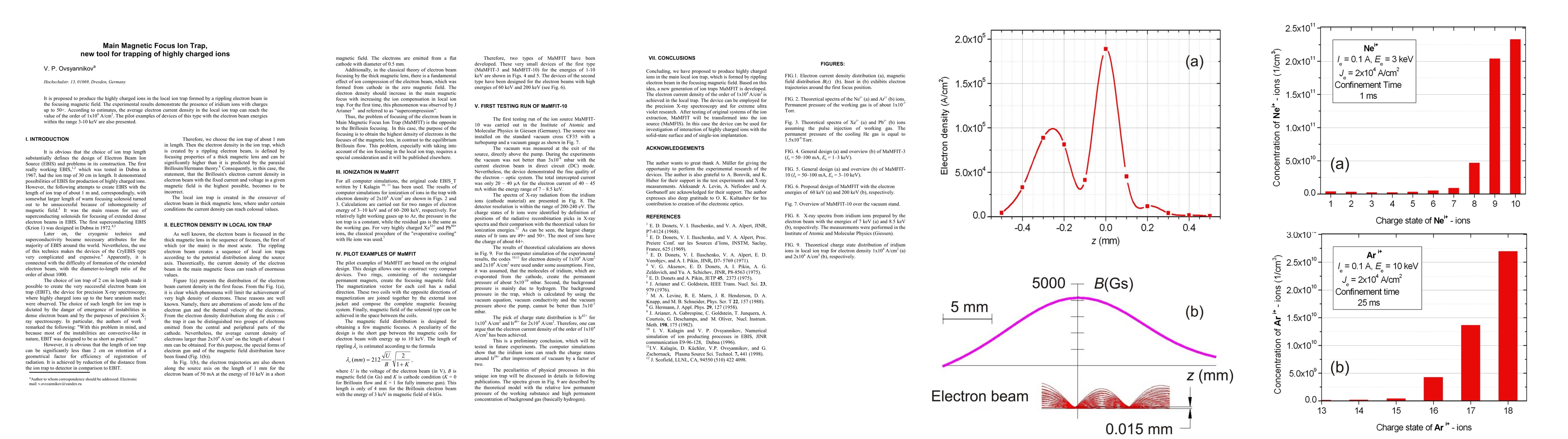 This paper introduces a Main Magnetic Focus Ion Trap that uses a rippling electron beam in a focusing magnetic field to trap highly charged ions, successfully demonstrating the trapping of iridium ions with charges up to 50+. The device can achieve an average electron current density of approximately 10 kA/cm^2, with pilot devices operating with electron beam energies between 3-10 keV.