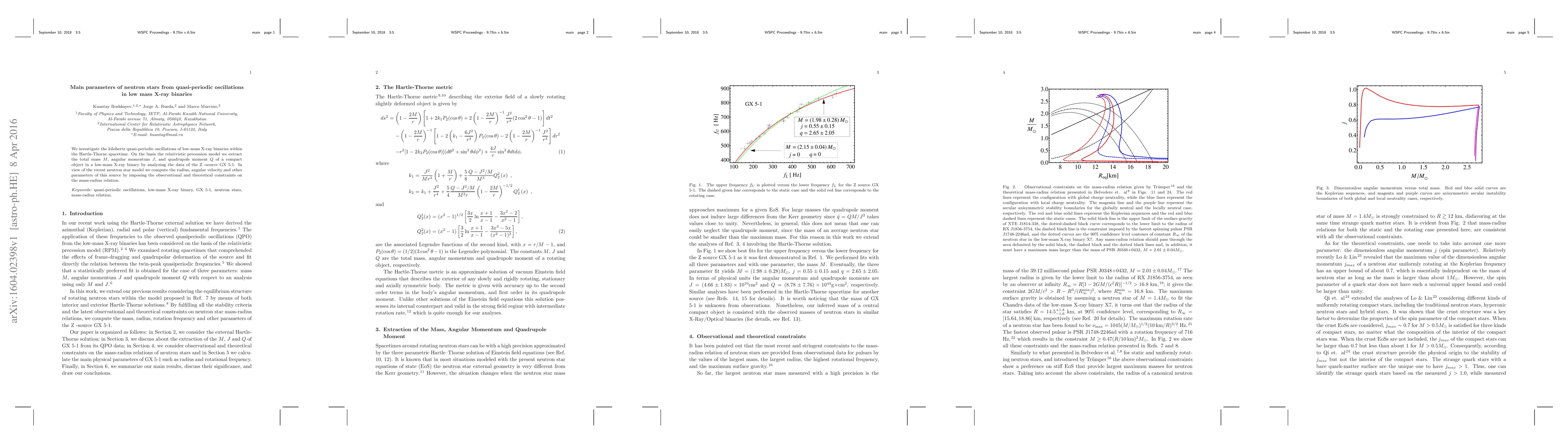 This research analyzes kilohertz quasi-periodic oscillations in low-mass X-ray binaries to determine the mass, angular momentum, and quadrupole moment of a neutron star in the Z-source GX 5-1. The study employs the relativistic precession model and observational data to derive the neutron star's radius and angular velocity, constrained by both theoretical models and empirical data.