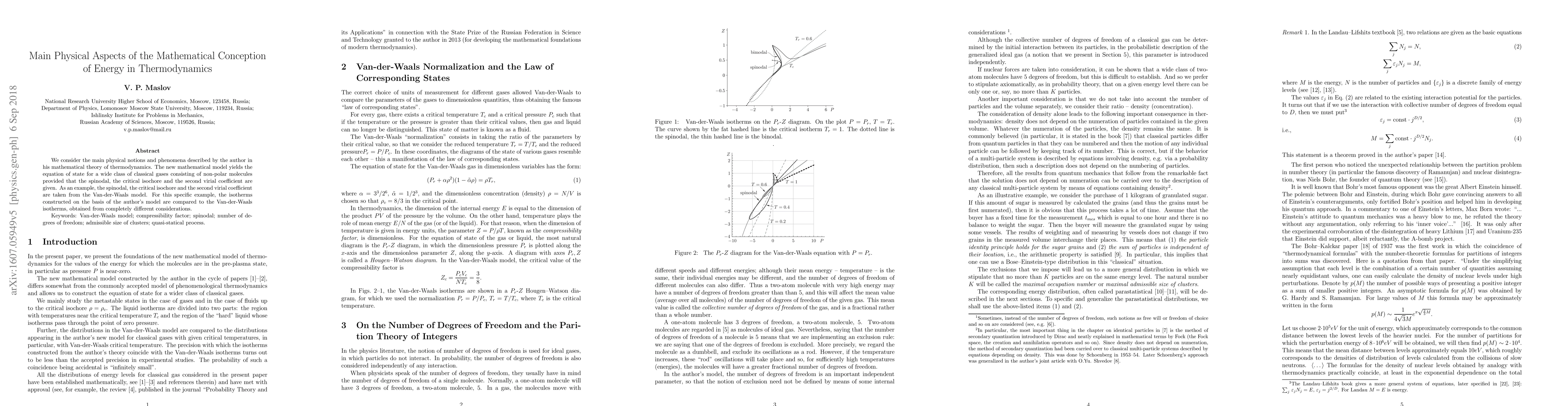 We consider the main physical notions and phenomena described by the author in his mathematical theory of thermodynamics. The new mathematical model yields the equation of state for a wide class of classical gases consisting of non-polar molecules provided that the spinodal, the critical isochore and the second virial coefficient are given. As an example, the spinodal, the critical isochore and the second virial coefficient are taken from the Van-der-Waals model. For this specific example, the isotherms constructed on the basis of the author's model are compared to the Van-der-Waals isotherms, obtained from completely different considerations.