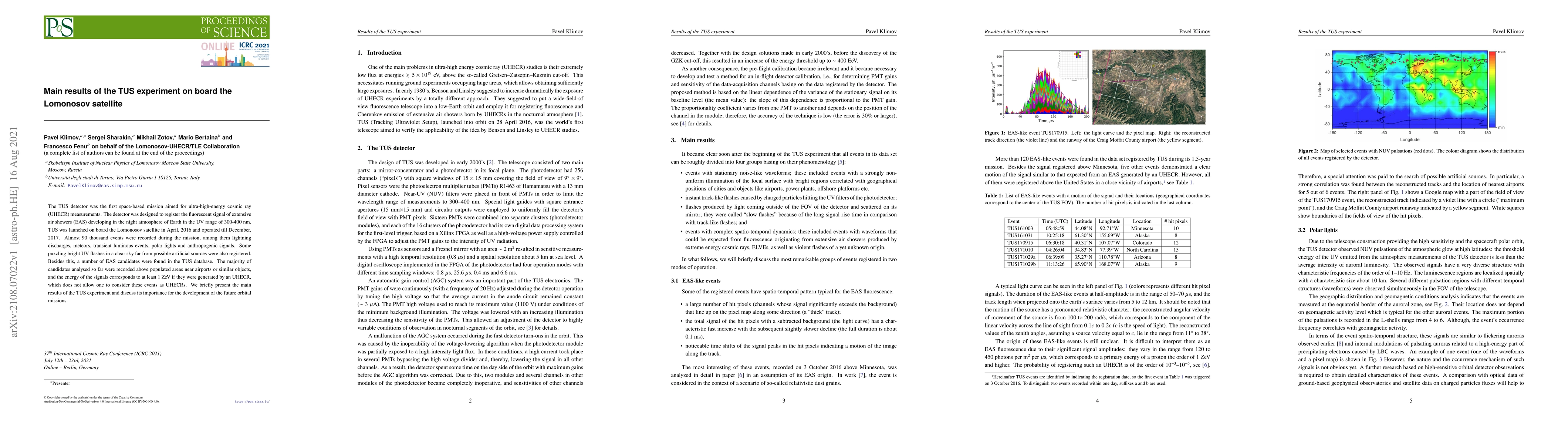 The TUS experiment, using the Lomonosov satellite, recorded nearly 90,000 events including lightning, meteors, and UV flashes. Among these, some potential ultra-high-energy cosmic ray (UHECR) candidates were identified, though their origin near human activity suggests alternative explanations.