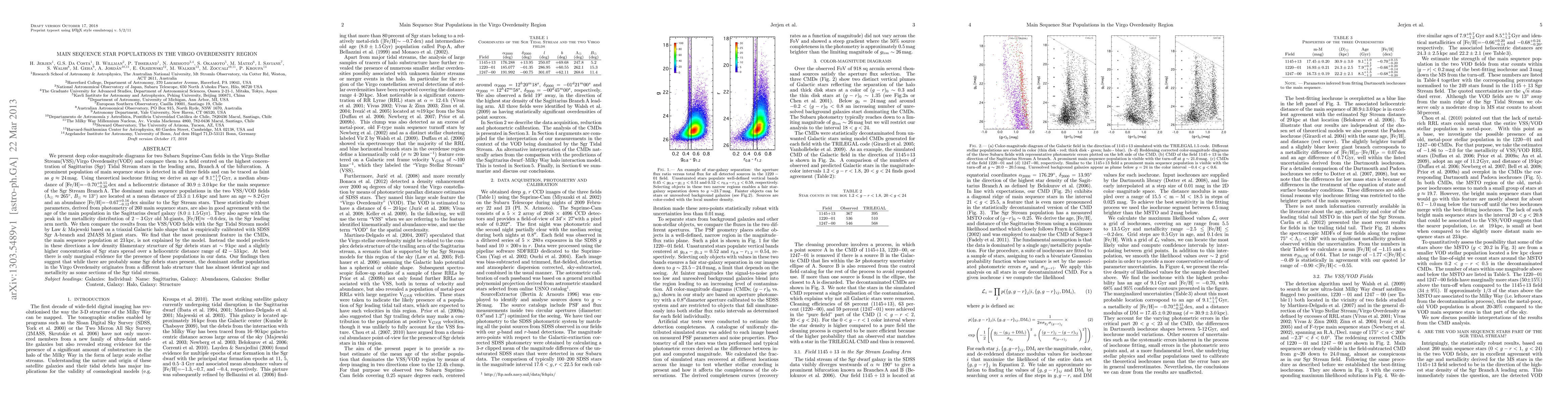 We present deep CMDs for two Subaru Suprime-Cam fields in the Virgo Stellar Stream(VSS)/Virgo Overdensity(VOD) and compare them to a field centred on the highest concentration of Sagittarius (Sgr) Tidal Stream stars in the leading arm, Branch A of the bifurcation. A prominent population of MS stars is detected in all three fields and can be traced as faint as g~24 mag. Using theoretical isochrone fitting we derive an age of 9.1(+1.0;-1.1)Gyr, a median abundance of [Fe/H]=-0.70 (+0.15; -0.20)dex and d_helio of 30.9+-3.0kpc for the MS of the Sgr Stream Branch A. The dominant main sequence populations in the two VSS/VOD fields (Lsun ~265 deg, Bsun ~13 deg) are located at a mean distance of 23.3+-1.6kpc and have an age ~8.2Gyr and an abundance [Fe/H]=-0.67(+0.16;-0.12)dex similar to the Sgr Stream stars. These parameters are also in good agreement with the age of the main population in the Sagittarius dwarf (8.0+-1.5Gyr). They also agree with the peak in the metallicity distribution of 2-3Gyr old M-giants, [Fe/H] ~ -0.6dex, in the Sgr leading arm north. We then compare the results from the VSS/VOD fields with the Sgr Tidal Stream model by Law & Majewski based on a triaxial Galactic halo that is calibrated with SDSS Sgr A-branch and 2MASS M-giant stars. We find that the most prominent feature in the CMDs, the MS population at 23kpc, is not explained by the model. Instead the model predicts in these directions a low density filamentary structure of Sgr debris stars at ~9kpc and a slightly higher concentration of Sgr stars spread from 42-53kpc. At best there is only marginal evidence for the presence of these populations in our data. Our findings then suggest that while there are probably some Sgr debris stars present, the dominant stellar population in the VOD originates from a different halo structure that has almost identical age and metallicity as some sections of the Sgr tidal stream.