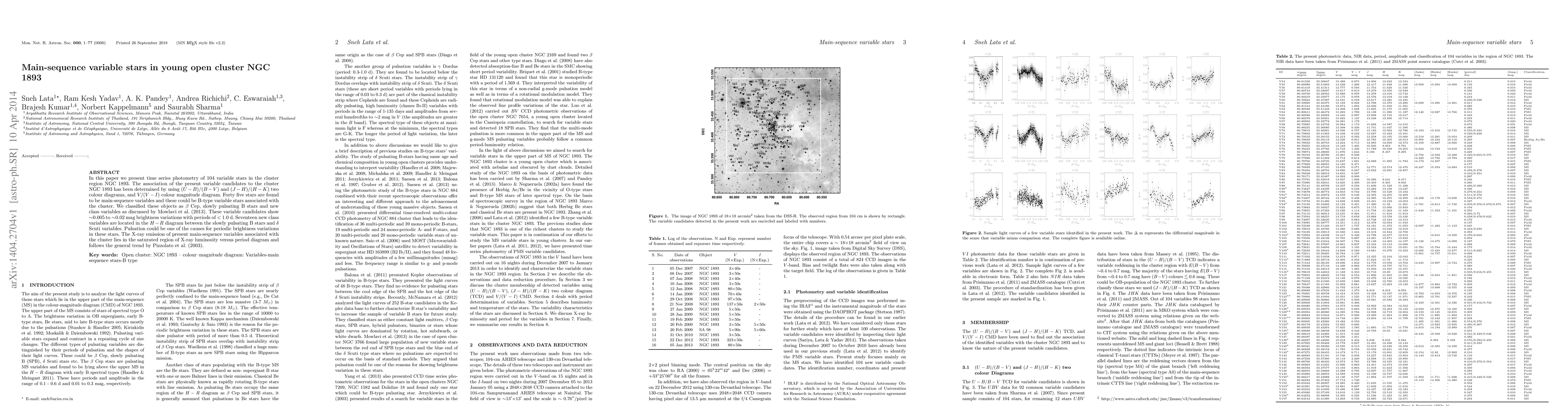 In this paper we present time series photometry of 104 variable stars in the cluster region NGC 1893. The association of the present variable candidates to the cluster NGC 1893 has been determined by using $(U-B)/(B-V)$ and $(J-H)/(H-K)$ two colour diagrams, and $V/(V-I)$ colour magnitude diagram. Forty five stars are found to be main-sequence variables and these could be B-type variable stars associated with the cluster. We classified these objects as $\beta$ Cep, slowly pulsating B stars and new class variables as discussed by Mowlavi et al. (2013). These variable candidates show $\sim$0.005 to $\sim$0.02 mag brightness variations with periods of $<$ 1.0 d. Seventeen new class variables are located in the $H-R$ diagram between the slowly pulsating B stars and $\delta$ Scuti variables. Pulsation could be one of the causes for periodic brightness variations in these stars. The X-ray emission of present main-sequence variables associated with the cluster lies in the saturated region of X-ray luminosity versus period diagram and follows the general trend by Pizzolato et al. (2003).