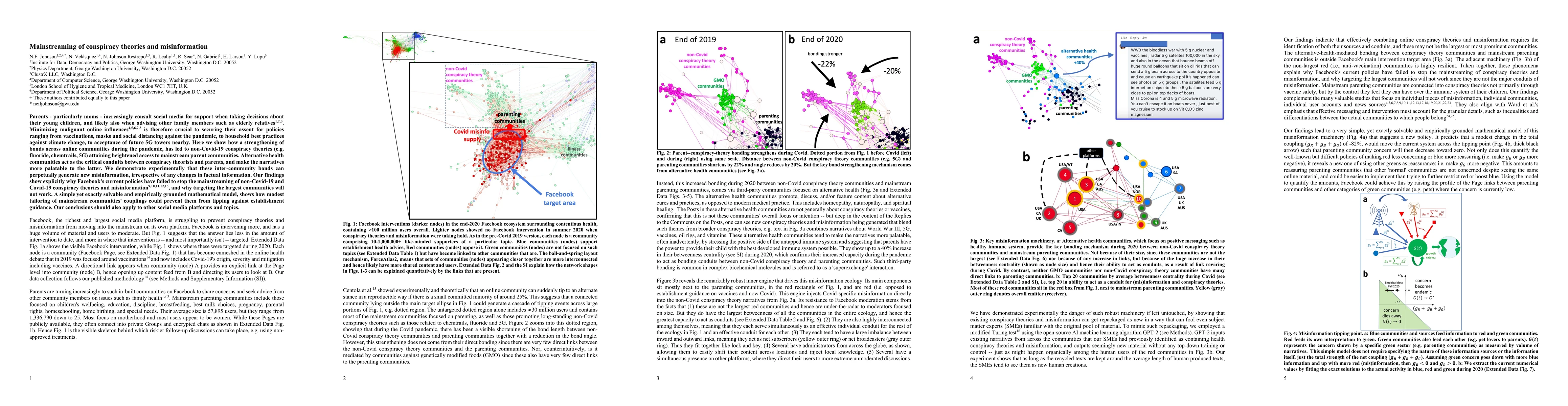 Parents - particularly moms - increasingly consult social media for support when taking decisions about their young children, and likely also when advising other family members such as elderly relatives. Minimizing malignant online influences is therefore crucial to securing their assent for policies ranging from vaccinations, masks and social distancing against the pandemic, to household best practices against climate change, to acceptance of future 5G towers nearby. Here we show how a strengthening of bonds across online communities during the pandemic, has led to non-Covid-19 conspiracy theories (e.g. fluoride, chemtrails, 5G) attaining heightened access to mainstream parent communities. Alternative health communities act as the critical conduits between conspiracy theorists and parents, and make the narratives more palatable to the latter. We demonstrate experimentally that these inter-community bonds can perpetually generate new misinformation, irrespective of any changes in factual information. Our findings show explicitly why Facebook's current policies have failed to stop the mainstreaming of non-Covid-19 and Covid-19 conspiracy theories and misinformation, and why targeting the largest communities will not work. A simple yet exactly solvable and empirically grounded mathematical model, shows how modest tailoring of mainstream communities' couplings could prevent them from tipping against establishment guidance. Our conclusions should also apply to other social media platforms and topics.