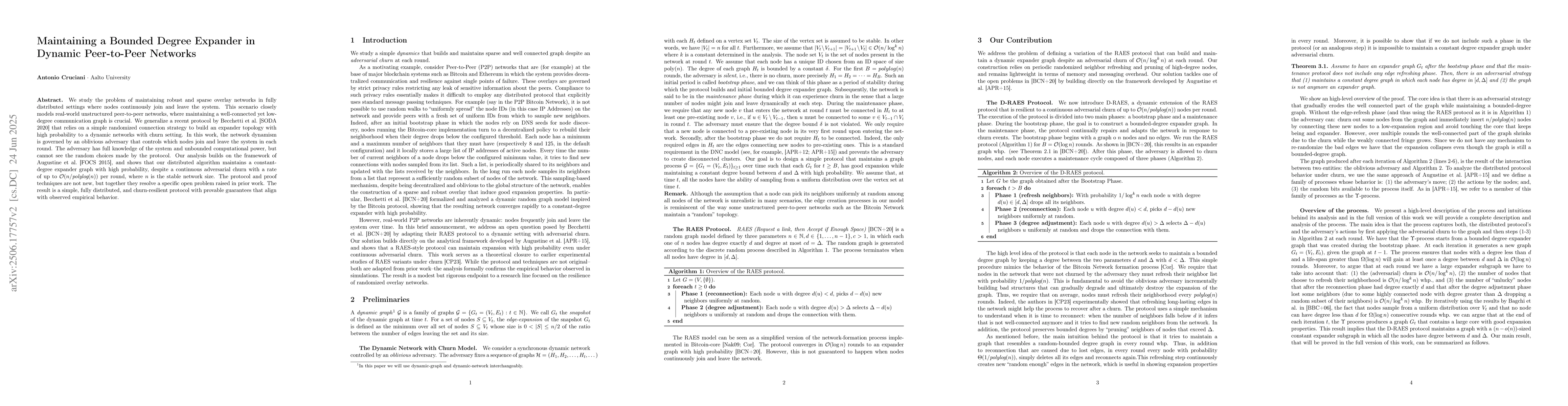 We study the problem of maintaining robust and sparse overlay networks in fully distributed settings where nodes continuously join and leave the system. This scenario closely models real-world unstructured peer-to-peer networks, where maintaining a well-connected yet low-degree communication graph is crucial. We generalize a recent protocol by Becchetti et al. [SODA 2020] that relies on a simple randomized connection strategy to build an expander topology with high probability to a dynamic networks with churn setting. In this work, the network dynamism is governed by an oblivious adversary that controls which nodes join and leave the system in each round. The adversary has full knowledge of the system and unbounded computational power, but cannot see the random choices made by the protocol. Our analysis builds on the framework of Augustine et al. [FOCS 2015], and shows that our distributed algorithm maintains a constant-degree expander graph with high probability, despite a continuous adversarial churn with a rate of up to $\mathcal{O}(n/polylog(n))$ per round, where $n$ is the stable network size. The protocol and proof techniques are not new, but together they resolve a specific open problem raised in prior work. The result is a simple, fully distributed, and churn-resilient protocol with provable guarantees that align with observed empirical behavior.