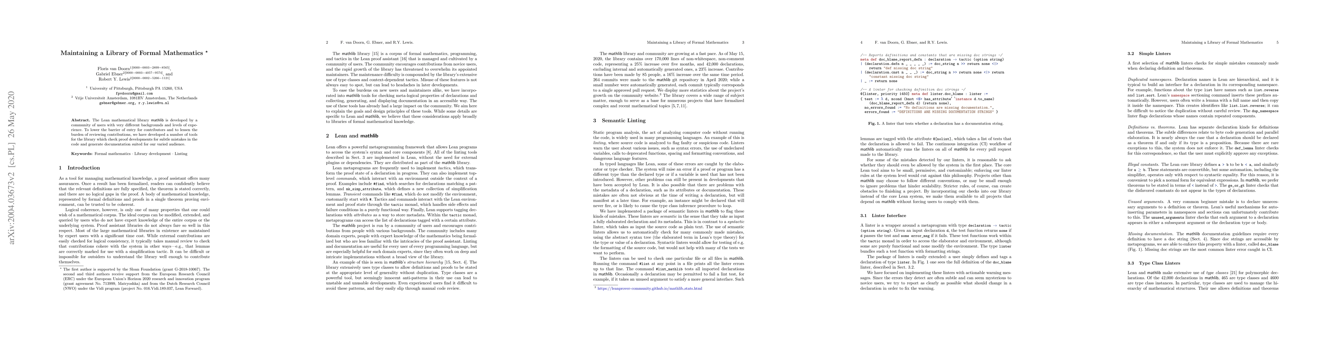 The Lean mathematical library mathlib is developed by a community of users with very different backgrounds and levels of experience. To lower the barrier of entry for contributors and to lessen the burden of reviewing contributions, we have developed a number of tools for the library which check proof developments for subtle mistakes in the code and generate documentation suited for our varied audience.