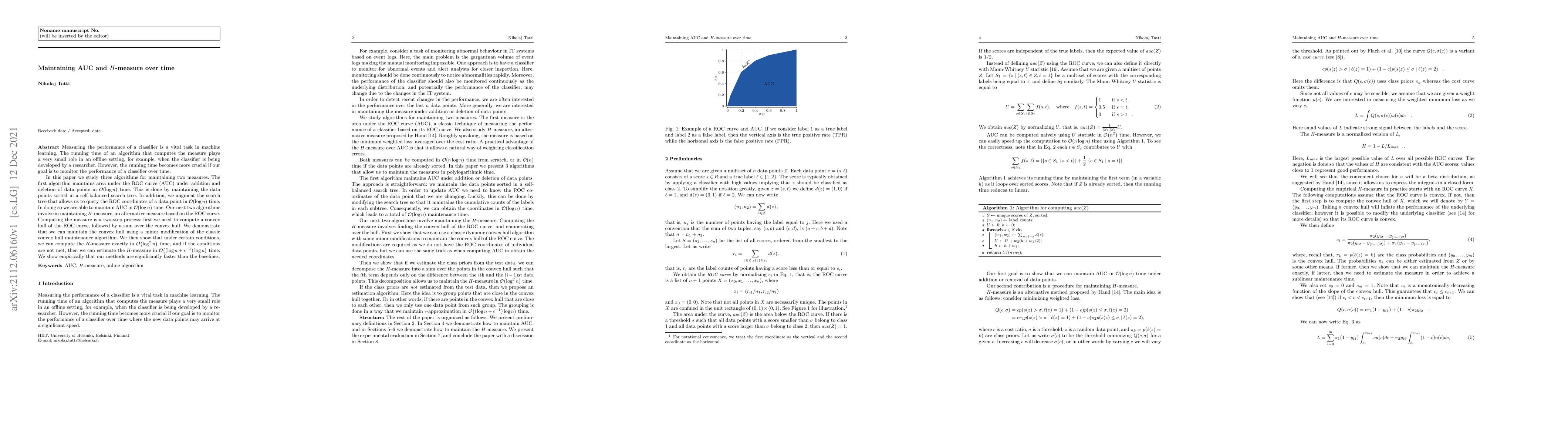 Measuring the performance of a classifier is a vital task in machine learning. The running time of an algorithm that computes the measure plays a very small role in an offline setting, for example, when the classifier is being developed by a researcher. However, the running time becomes more crucial if our goal is to monitor the performance of a classifier over time. In this paper we study three algorithms for maintaining two measures. The first algorithm maintains area under the ROC curve (AUC) under addition and deletion of data points in $O(\log n)$ time. This is done by maintaining the data points sorted in a self-balanced search tree. In addition, we augment the search tree that allows us to query the ROC coordinates of a data point in $O(\log n)$ time. In doing so we are able to maintain AUC in $O(\log n)$ time. Our next two algorithms involve in maintaining $H$-measure, an alternative measure based on the ROC curve. Computing the measure is a two-step process: first we need to compute a convex hull of the ROC curve, followed by a sum over the convex hull. We demonstrate that we can maintain the convex hull using a minor modification of the classic convex hull maintenance algorithm. We then show that under certain conditions, we can compute the $H$-measure exactly in $O(\log^2 n)$ time, and if the conditions are not met, then we can estimate the $H$-measure in $O((\log n + \epsilon^{-1})\log n)$ time. We show empirically that our methods are significantly faster than the baselines.