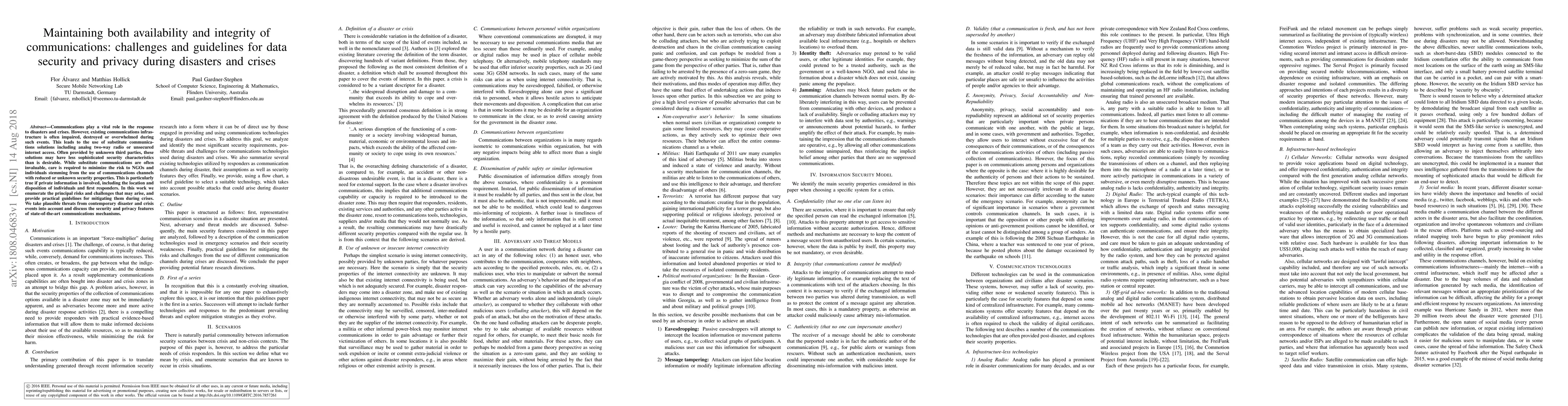 This paper identifies risks and challenges to maintaining secure and reliable communications during disasters and crises, emphasizing the use of insecure substitute solutions. It provides practical guidelines to mitigate these risks, focusing on protecting data security and privacy, especially concerning sensitive information of individuals and first responders.