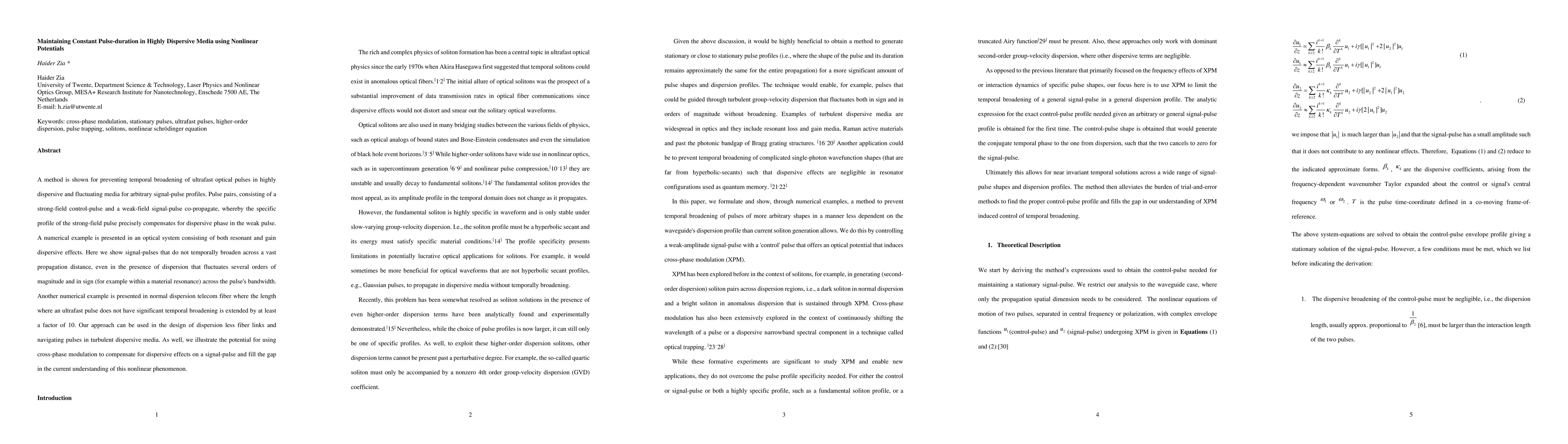 This paper presents a method for maintaining constant pulse duration in ultrafast optical pulses traversing highly dispersive media, using a strong-field control-pulse to compensate for dispersive phase shifts. The technique employs cross-phase modulation to prevent temporal broadening, even in fluctuating dispersive environments.