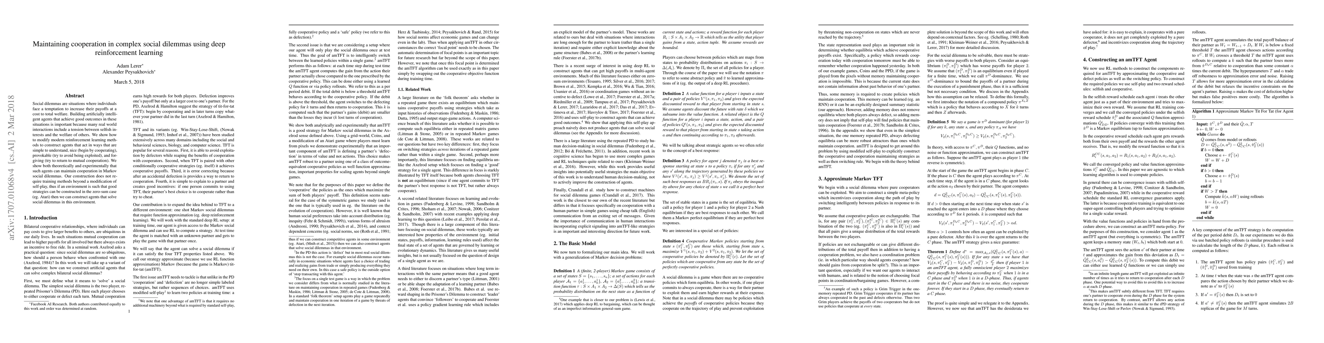 This paper explores the use of deep reinforcement learning to create intelligent agents capable of maintaining cooperation in complex social dilemmas. The proposed agents are designed to be simple, cooperative, provokable, and forgiving, demonstrating effective cooperation maintenance both theoretically and experimentally in Markov social dilemmas.
