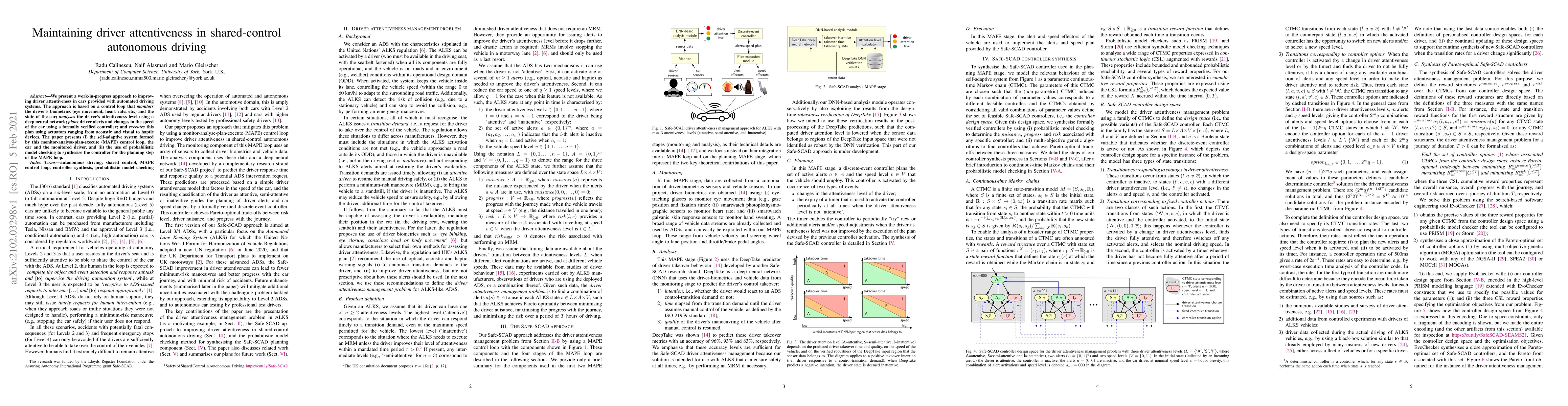 We present a work-in-progress approach to improving driver attentiveness in cars provided with automated driving systems. The approach is based on a control loop that monitors the driver's biometrics (eye movement, heart rate, etc.) and the state of the car; analyses the driver's attentiveness level using a deep neural network; plans driver alerts and changes in the speed of the car using a formally verified controller; and executes this plan using actuators ranging from acoustic and visual to haptic devices. The paper presents (i) the self-adaptive system formed by this monitor-analyse-plan-execute (MAPE) control loop, the car and the monitored driver, and (ii) the use of probabilistic model checking to synthesise the controller for the planning step of the MAPE loop.