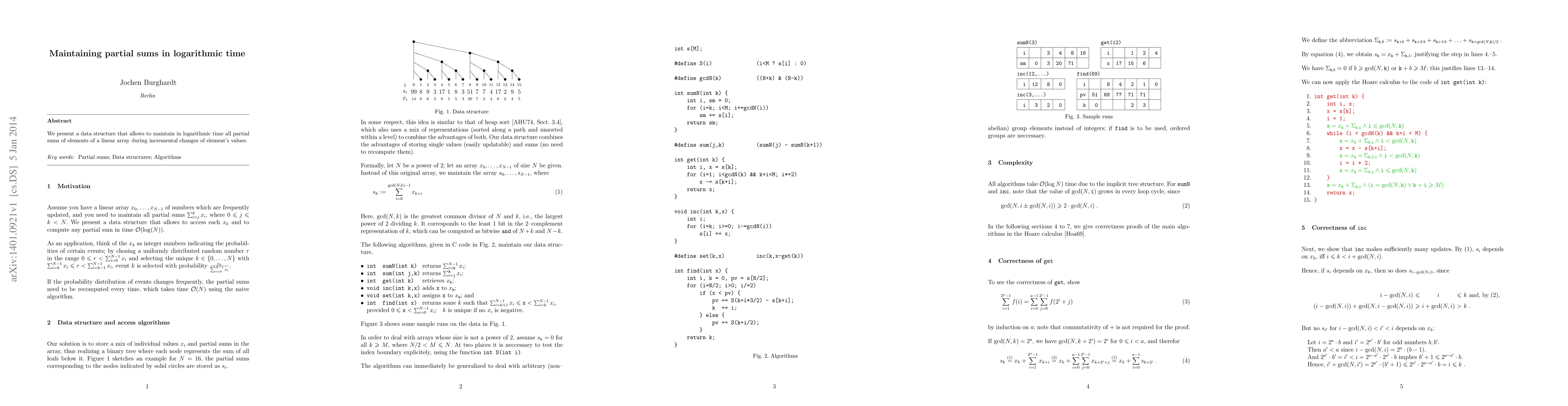 This paper introduces a data structure enabling logarithmic time maintenance of all partial sums in a dynamic linear array, facilitating efficient updates to element values.