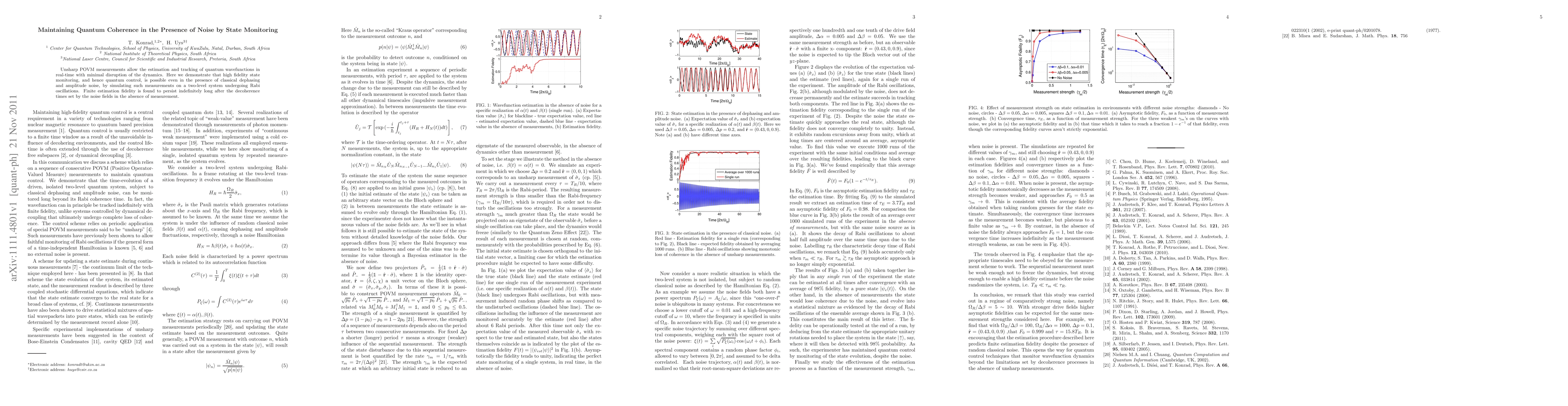 This paper demonstrates that high fidelity state monitoring can maintain quantum coherence in noisy environments through unsharp POVM measurements, showing that finite estimation fidelity persists even after decoherence times in a two-level system undergoing Rabi oscillations.