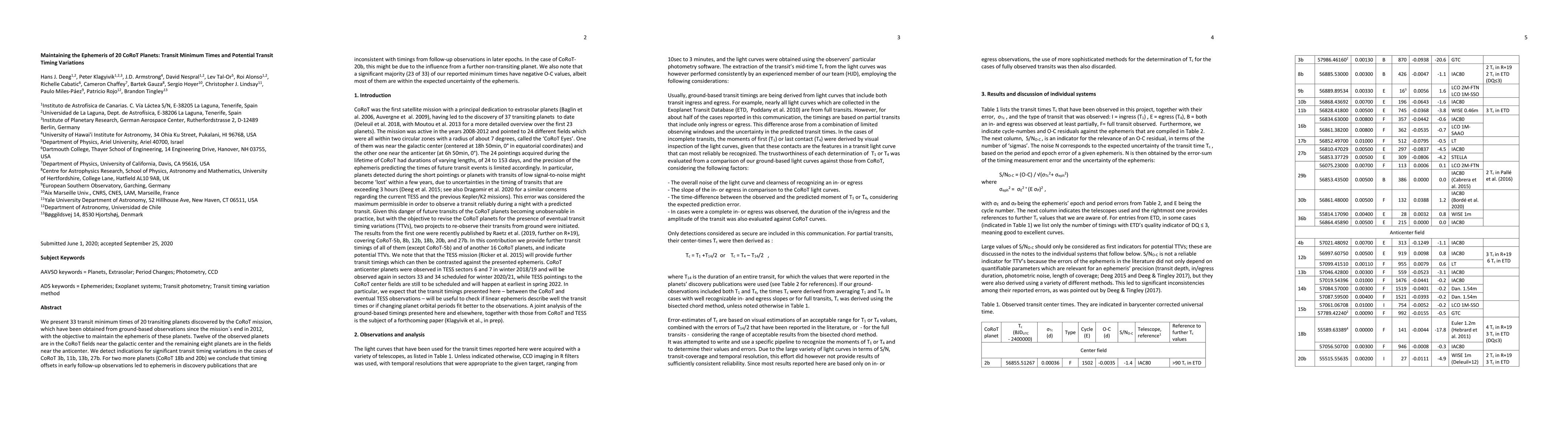 We present 33 transit minimum times of 20 transiting planets discovered by the CoRoT mission, which have been obtained from ground-based observations since the mission's end in 2012, with the objective to maintain the ephemeris of these planets. Twelve of the observed planets are in the CoRoT fields near the galactic center and the remaining eight planets are in the fields near the anticenter. We detect indications for significant transit timing variations in the cases of CoRoT 3b, 11b, 13b, 27b. For two more planets (CoRoT 18b and 20b) we conclude that timing offsets in early follow-up observations led to ephemeris in discovery publications that are inconsistent with timings from follow-up observations in later epochs. In the case of CoRoT-20b, this might be due to the influence from a further non-transiting planet. We also note that a significant majority (23 of 33) of our reported minimum times have negative O-C values, albeit most of them are within the expected uncertainty of the ephemeris.