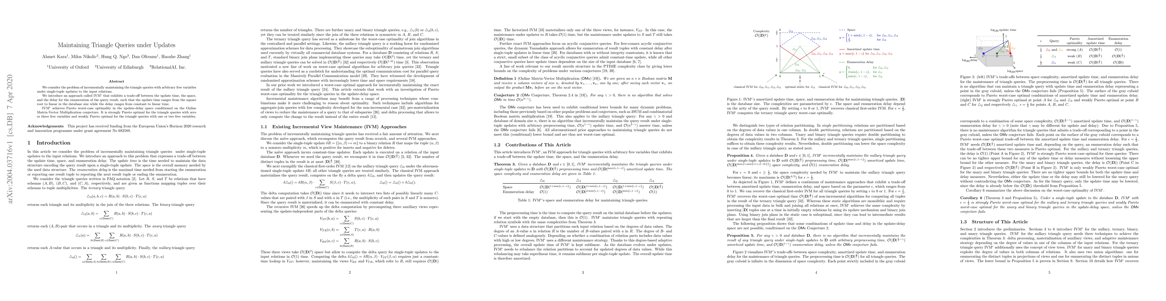 This paper presents IVM$^\epsilon$, an approach for maintaining triangle queries under single-tuple updates, balancing update time, space, and query result enumeration delay. It achieves Pareto optimality under certain conditions, optimizing performance for queries with varying numbers of free variables.