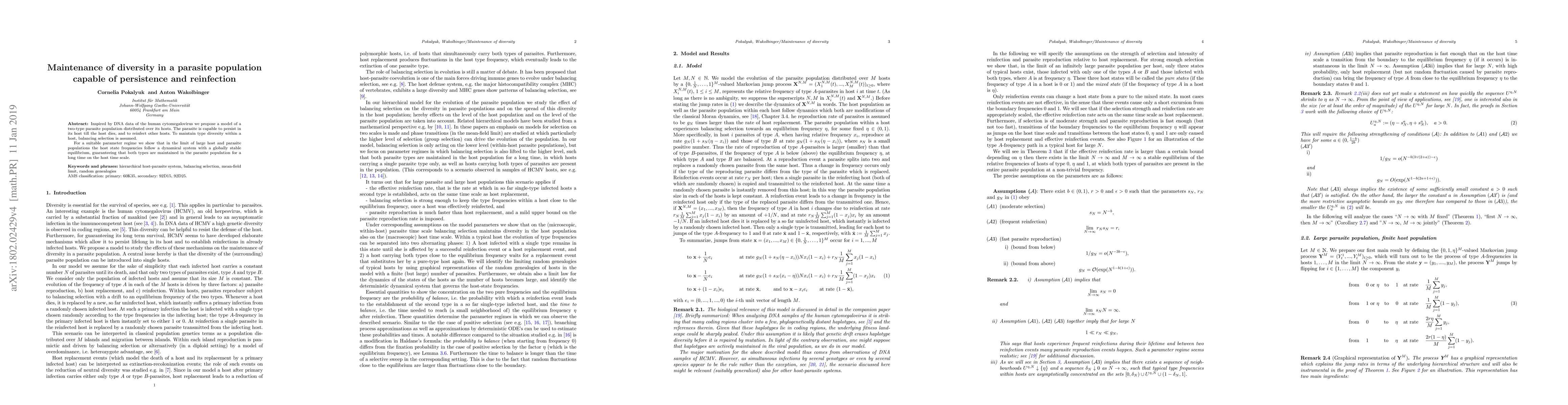 Inspired by DNA data of the human cytomegalovirus we propose a model of a two-type parasite population distributed over its hosts. The parasite is capable to persist in its host till the host dies, and to reinfect other hosts. To maintain type diversity within a host, balancing selection is assumed. For a suitable parameter regime we show that in the limit of large host and parasite populations the host state frequencies follow a dynamical system with a globally stable equilibrium, guaranteeing that both types are maintained in the parasite population for a long time on the host time scale.