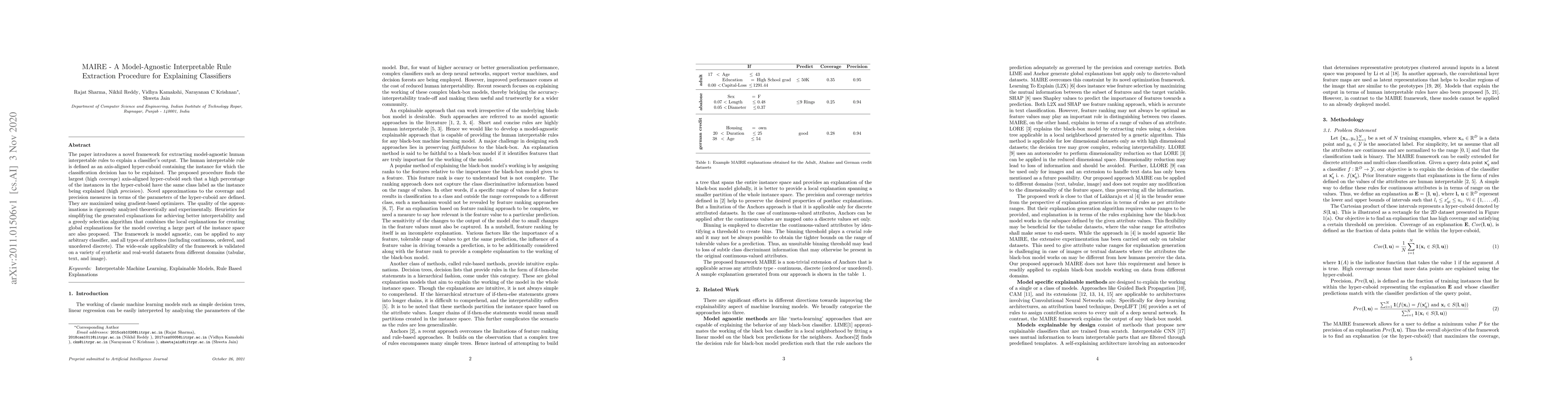A new framework, MAIRE, is introduced to explain classifier outputs in a human-interpretable way by finding the largest hyper-cuboid containing instances with matching class labels. The framework can be applied to any classifier and various attribute types, offering model-agnostic interpretability.