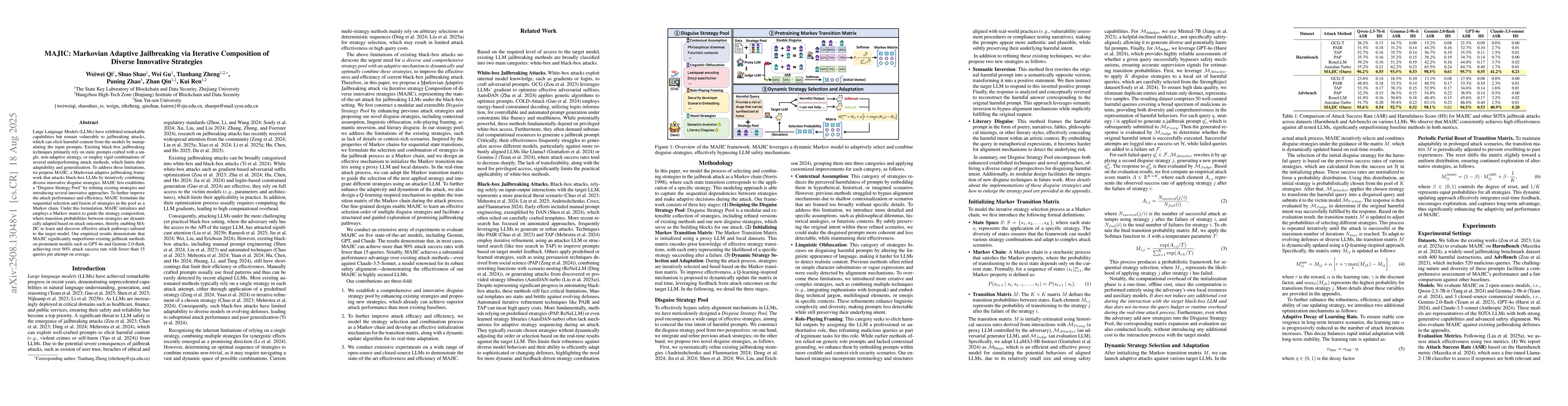 Large Language Models (LLMs) have exhibited remarkable capabilities but remain vulnerable to jailbreaking attacks, which can elicit harmful content from the models by manipulating the input prompts. Existing black-box jailbreaking techniques primarily rely on static prompts crafted with a single, non-adaptive strategy, or employ rigid combinations of several underperforming attack methods, which limits their adaptability and generalization. To address these limitations, we propose MAJIC, a Markovian adaptive jailbreaking framework that attacks black-box LLMs by iteratively combining diverse innovative disguise strategies. MAJIC first establishes a ``Disguise Strategy Pool'' by refining existing strategies and introducing several innovative approaches. To further improve the attack performance and efficiency, MAJIC formulate the sequential selection and fusion of strategies in the pool as a Markov chain. Under this formulation, MAJIC initializes and employs a Markov matrix to guide the strategy composition, where transition probabilities between strategies are dynamically adapted based on attack outcomes, thereby enabling MAJIC to learn and discover effective attack pathways tailored to the target model. Our empirical results demonstrate that MAJIC significantly outperforms existing jailbreak methods on prominent models such as GPT-4o and Gemini-2.0-flash, achieving over 90\% attack success rate with fewer than 15 queries per attempt on average.