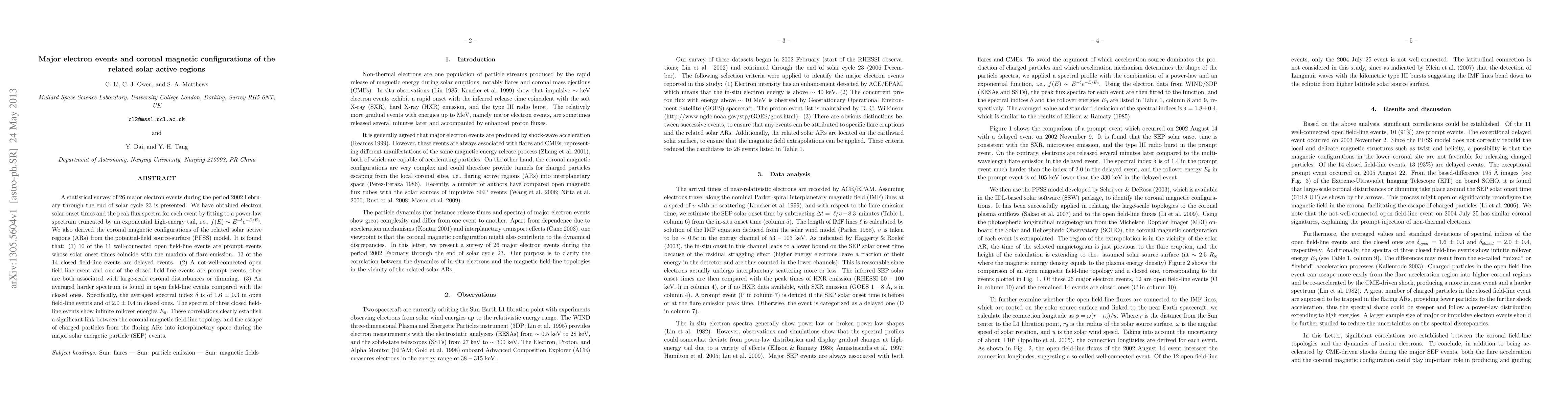 This study analyzes 26 major electron events from 2002 to the end of solar cycle 23, determining solar onset times, peak flux spectra, and coronal magnetic configurations using the potential-field source-surface model. Key findings include: 1) Most well-connected open field-line events are prompt, coinciding with flare emission peaks, while delayed events are predominantly closed. 2) Some events, despite poor connection, are prompt and linked to large coronal disturbances. 3) Open field-line events have harder spectra (index 1.6 ± 0.3) than closed ones (index 2.0 ± 0.4), with three closed events exhibiting infinite rollover energies. These results highlight the connection between magnetic field-line topology and solar energetic particle escape.