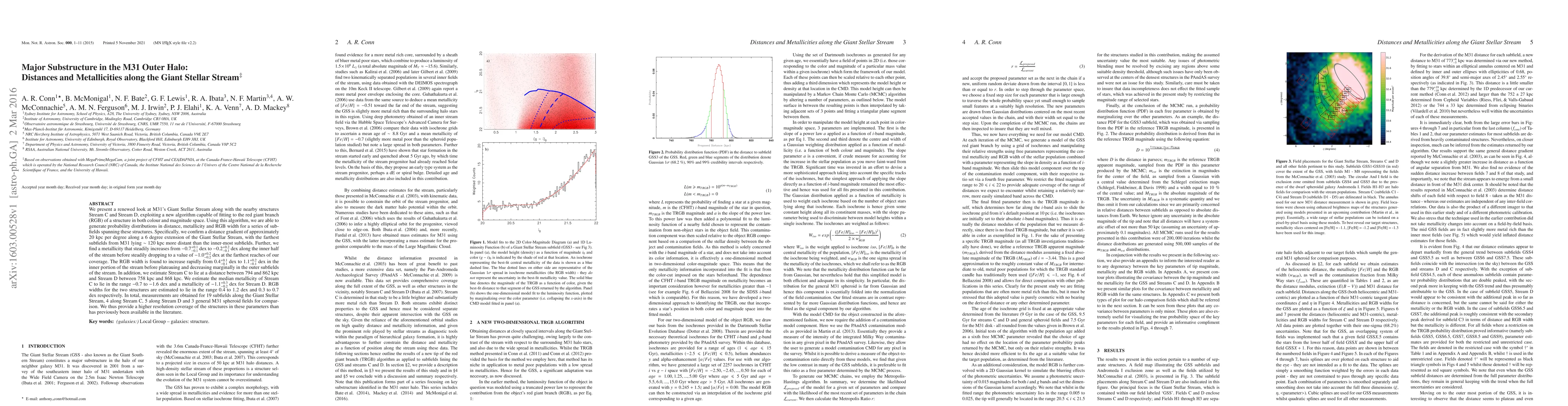 We present a renewed look at M31's Giant Stellar Stream along with the nearby structures Stream C and Stream D, exploiting a new algorithm capable of fitting to the red giant branch (RGB) of a structure in both colour and magnitude space. Using this algorithm, we are able to generate probability distributions in distance, metallicity and RGB width for a series of subfields spanning these structures. Specifically, we confirm a distance gradient of approximately 20 kpc per degree along a 6 degree extension of the Giant Stellar Stream, with the farthest subfields from M31 lying ~ 120 kpc more distant than the inner-most subfields. Further, we find a metallicity that steadily increases from -0.7^{+0.1}_{-0.1} dex to -0.2^{+0.2}_{-0.1} dex along the inner half of the stream before steadily dropping to a value of -1.0^{+0.2}_{-0.2} dex at the farthest reaches of our coverage. The RGB width is found to increase rapidly from 0.4^{+0.1}_{-0.1} dex to 1.1^{+0.2}_{-0.1} dex in the inner portion of the stream before plateauing and decreasing marginally in the outer subfields of the stream. In addition, we estimate Stream C to lie at a distance between 794 and 862 kpc and Stream D between 758 kpc and 868 kpc. We estimate the median metallicity of Stream C to lie in the range -0.7 to -1.6 dex and a metallicity of -1.1^{+0.3}_{-0.2} dex for Stream D. RGB widths for the two structures are estimated to lie in the range 0.4 to 1.2 dex and 0.3 to 0.7 dex respectively. In total, measurements are obtained for 19 subfields along the Giant Stellar Stream, 4 along Stream C, 5 along Stream D and 3 general M31 spheroid fields for comparison. We thus provide a higher resolution coverage of the structures in these parameters than has previously been available in the literature.