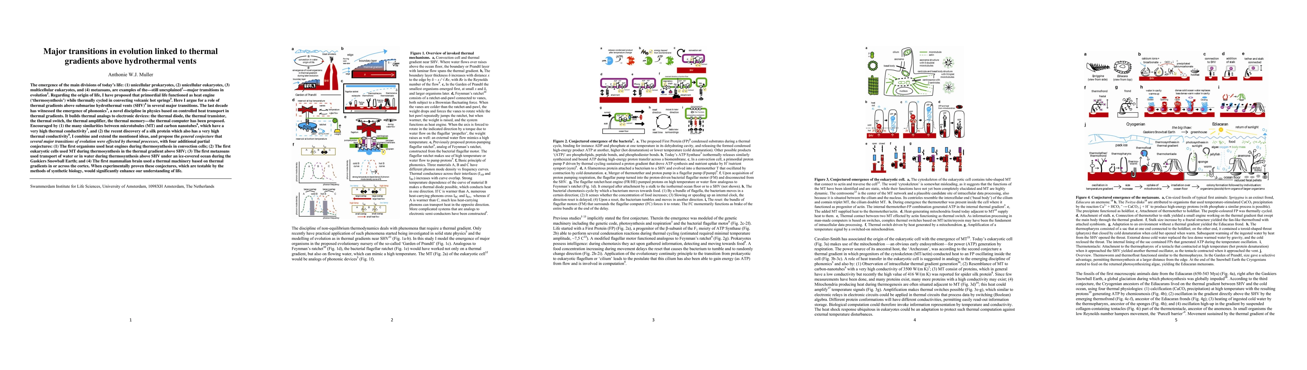 The emergence of the main divisions of today's life: (1) unicellular prokaryotes, (2) unicellular eukaryotes, (3) multicellular eukaryotes, and (4) metazoans, are examples of the--still unexplained--major transitions in evolution. Regarding the origin of life, I have proposed that primordial life functioned as heat engine (thermosynthesis) while thermally cycled in convecting volcanic hot springs. Here I argue for a role of thermal gradients above submarine hydrothermal vents (SHV) in several major transitions. The last decade has witnessed the emergence of phononics, a novel discipline in physics based on controlled heat transport in thermal gradients. It builds thermal analogs to electronic devices: the thermal diode, the thermal transistor, the thermal switch, the thermal amplifier, the thermal memory--the thermal computer has been proposed. Encouraged by (1) the many similarities between microtubules (MT) and carbon nanotubes, which have a very high thermal conductivity, and (2) the recent discovery of a silk protein which also has a very high thermal conductivity, I combine and extend the mentioned ideas, and propose the general conjecture that several major transitions of evolution were effected by thermal processes, with four additional partial conjectures: (1) The first organisms used heat engines during thermosynthesis in convection cells; (2) The first eukaryotic cells used MT during thermosynthesis in the thermal gradient above SHV; (3) The first metazoans used transport of water or in water during thermosynthesis above SHV under an ice-covered ocean during the Gaskiers Snowball Earth; and (4) The first mammalian brain used a thermal machinery based on thermal gradients in or across the cortex. When experimentally proven these conjectures, which are testable by the methods of synthetic biology, would significantly enhance our understanding of life.