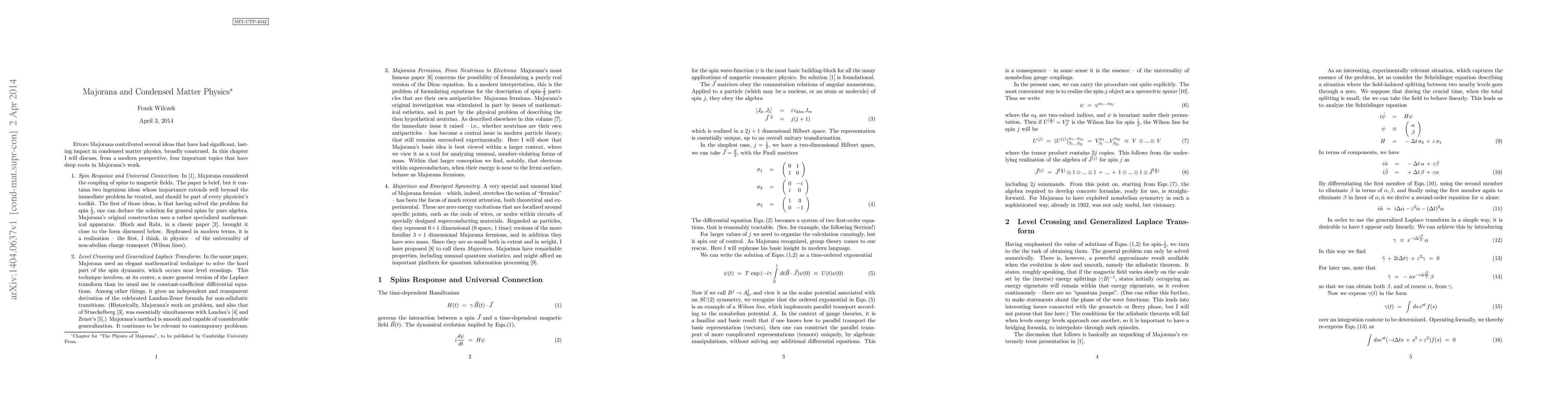 Ettore Majorana contributed several ideas that have had significant, lasting impact in condensed matter physics, broadly construed. Here I will discuss, from a modern perspective, four important topics that have deep roots in Majorana's work: 1. Spin Response and Universal Connection; 2. Level Crossing and Generalized Laplace Transform; 3. Majorana Fermions, From Neutrinos to Electrons; 4. Majorinos and Emergent Symmetry.