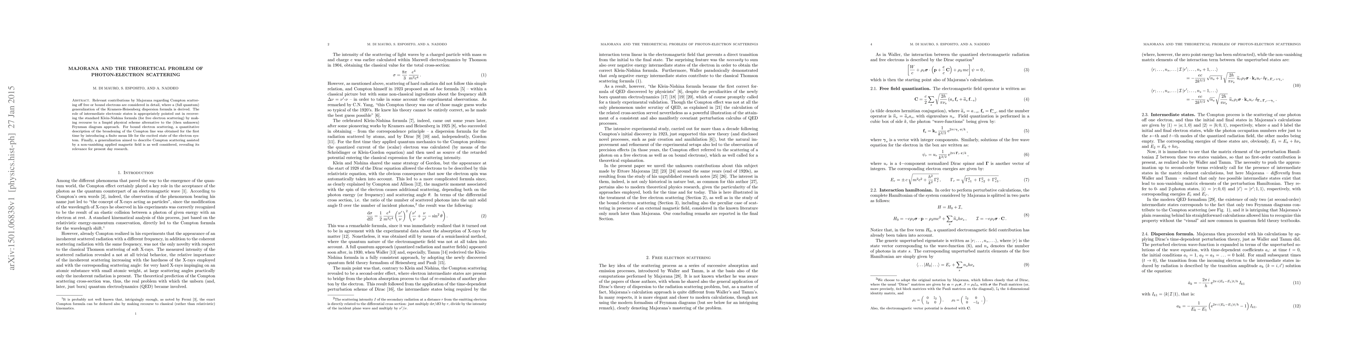 Relevant contributions by Majorana regarding Compton scattering off free or bound electrons are considered in detail, where a (full quantum) generalization of the Kramers-Heisenberg dispersion formula is derived. The role of intermediate electronic states is appropriately pointed out in recovering the standard Klein-Nishina formula (for free electron scattering) by making recourse to a limpid physical scheme alternative to the (then unknown) Feynman diagram approach. For bound electron scattering, a quantitative description of the broadening of the Compton line was obtained for the first time by introducing a finite mean life for the excited state of the electron system. Finally, a generalization aimed to describe Compton scattering assisted by a non-vanishing applied magnetic field is as well considered, revealing its relevance for present day research.
