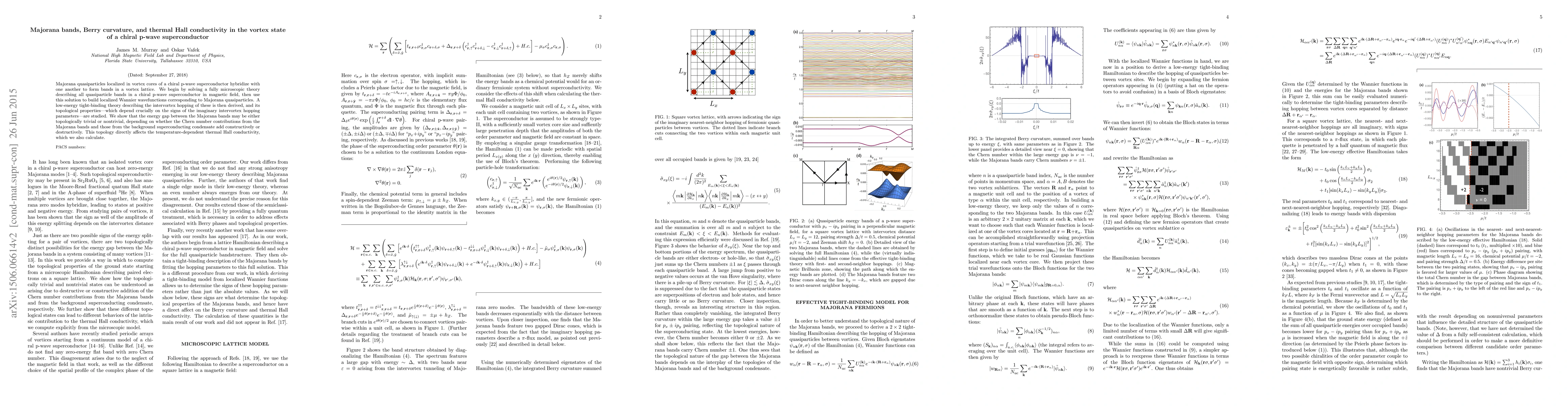 Majorana quasiparticles localized in vortex cores of a chiral p-wave superconductor hybridize with one another to form bands in a vortex lattice. We begin by solving a fully microscopic theory describing all quasiparticle bands in a chiral p-wave superconductor in magnetic field, then use this solution to build localized Wannier wavefunctions corresponding to Majorana quasiparticles. A low-energy tight-binding theory describing the intervortex hopping of these is then derived, and its topological properties---which depend crucially on the signs of the imaginary intervortex hopping parameters---are studied. We show that the energy gap between the Majorana bands may be either topologically trivial or nontrivial, depending on whether the Chern number contributions from the Majorana bands and those from the background superconducting condensate add constructively or destructively. This topology directly affects the temperature-dependent thermal Hall conductivity, which we also calculate.